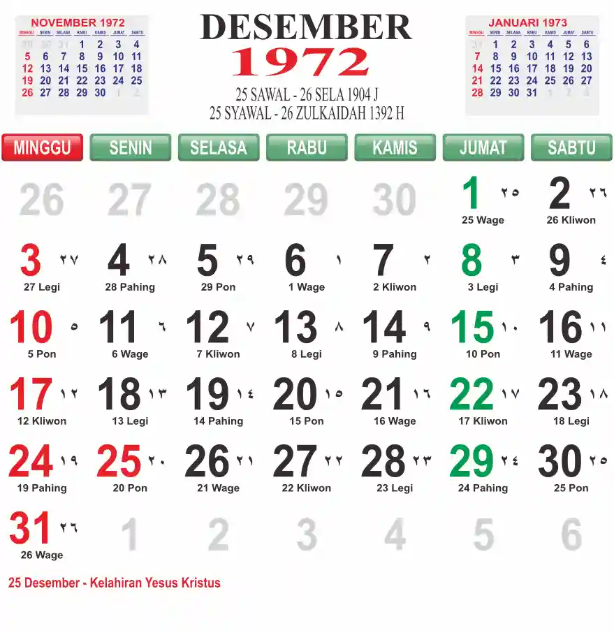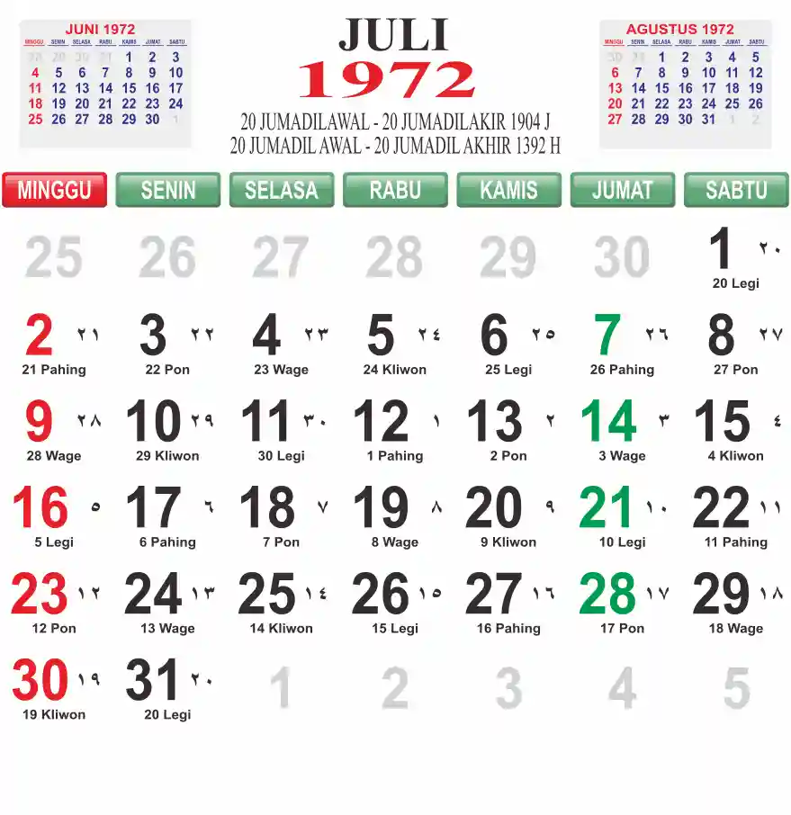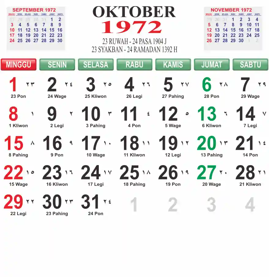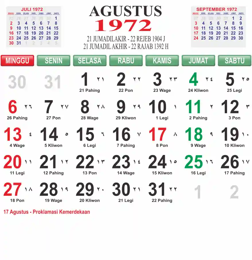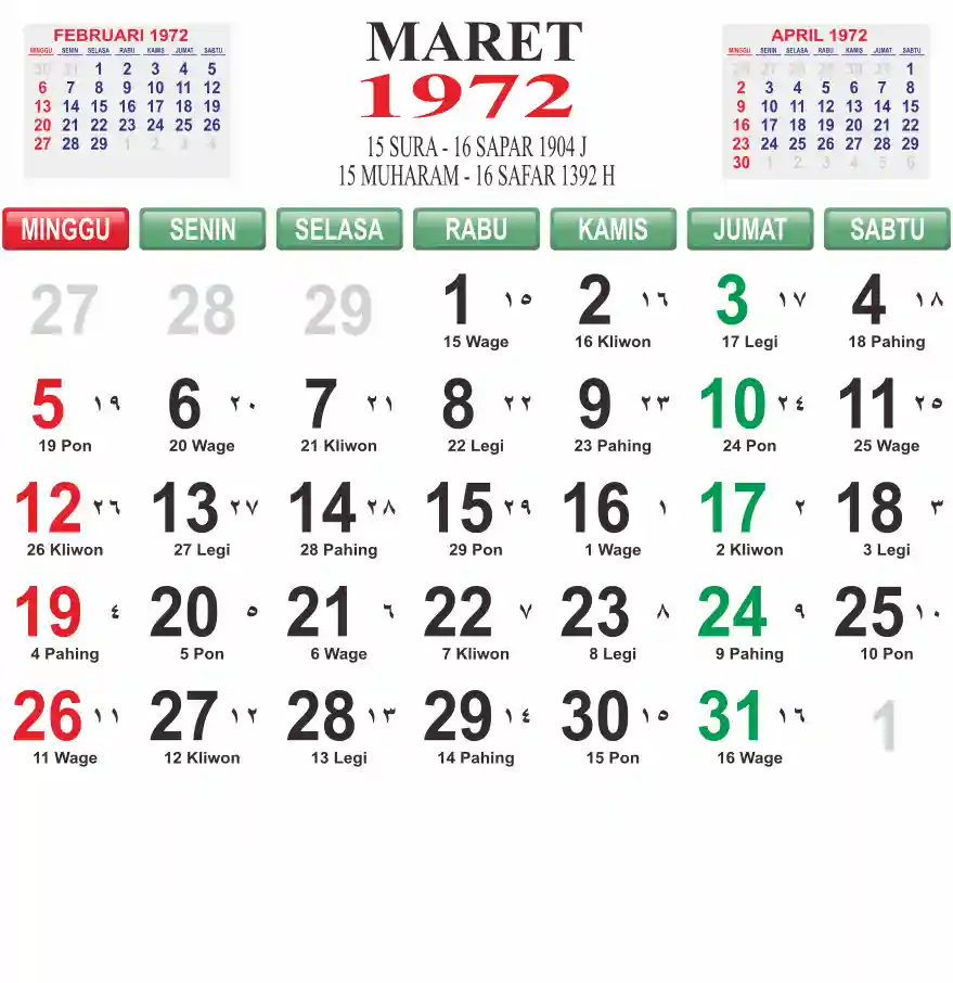 Template kalender 1972 lembaran besar jumbo yang mudah di baca dari jarak jauh. Kalender ini biasanya di cetak 1 lembar per bulan.