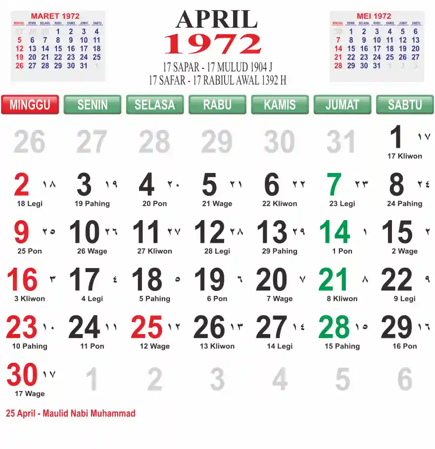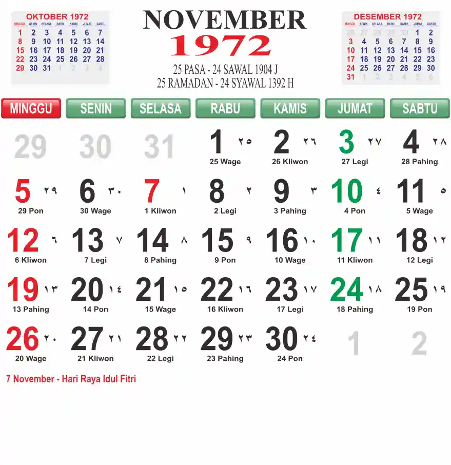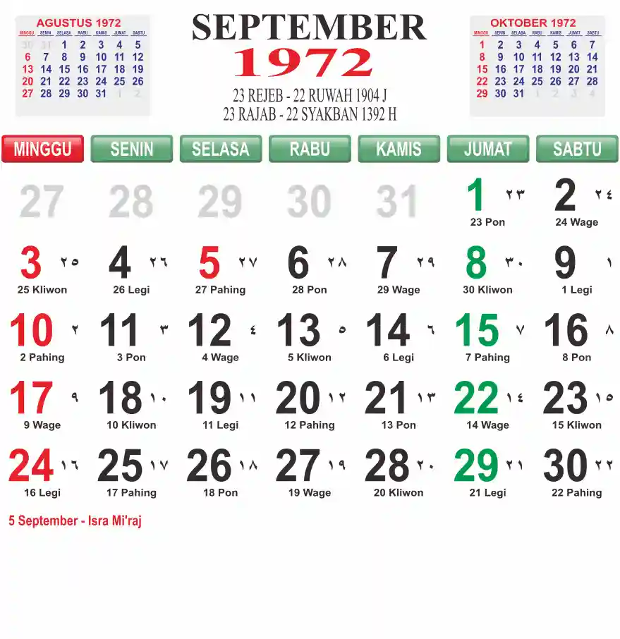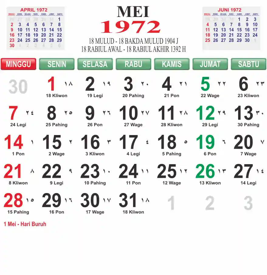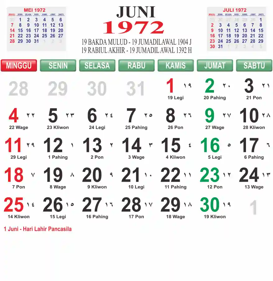 Template kalender 1972 lembaran besar jumbo yang mudah di baca dari jarak jauh. Kalender ini biasanya di cetak 1 lembar per bulan.