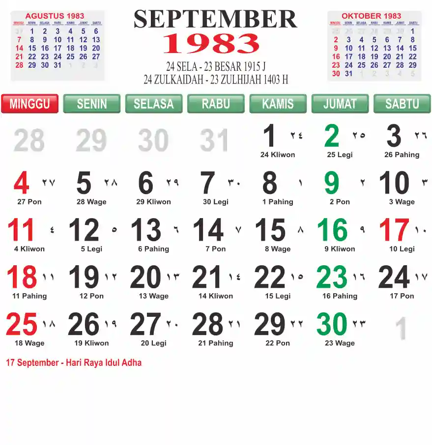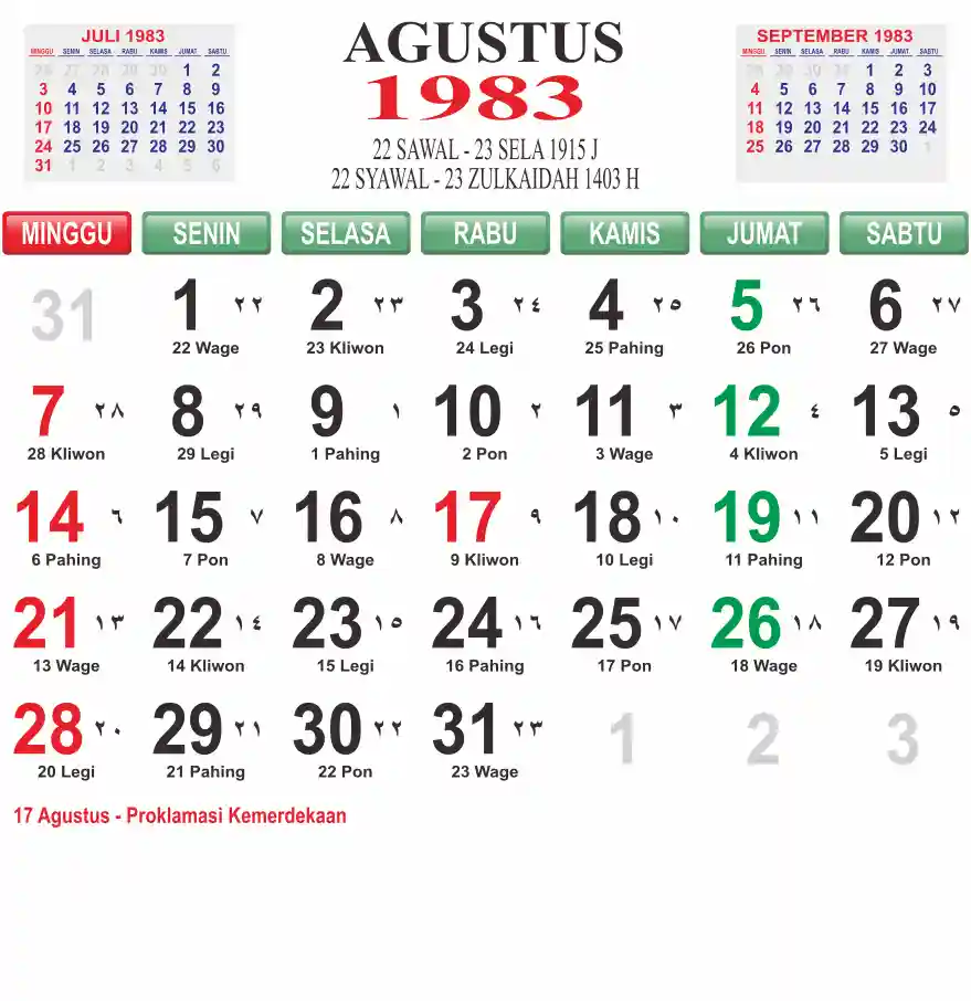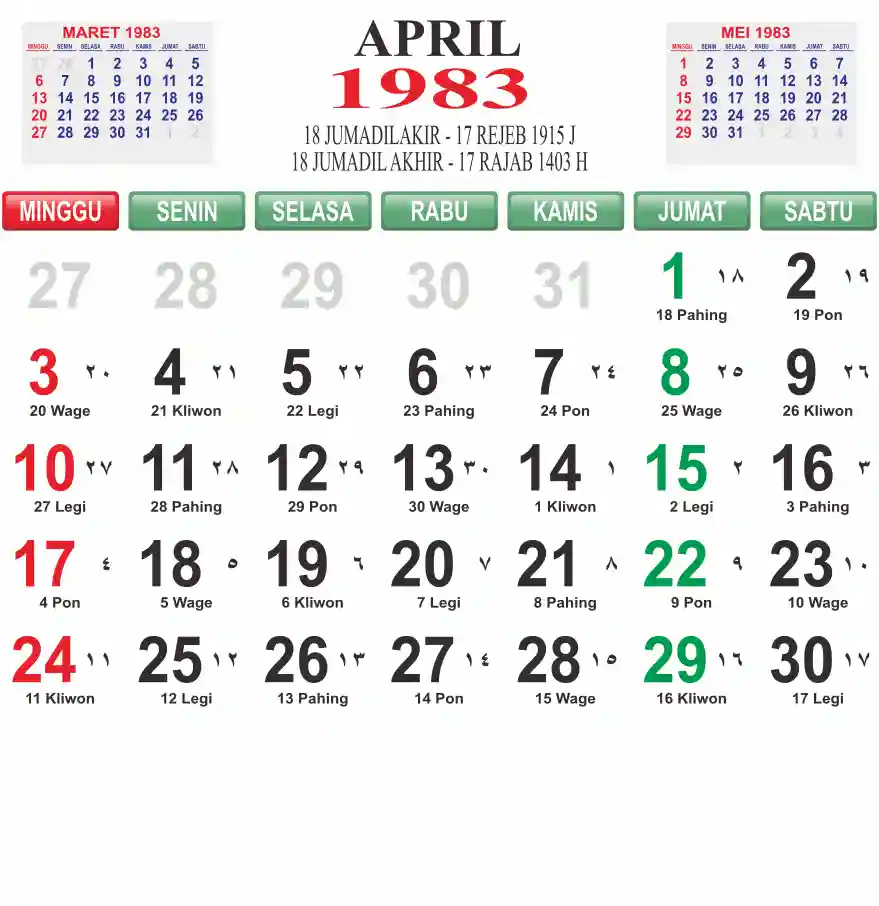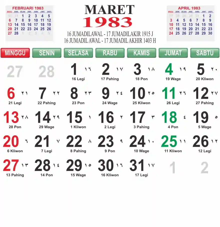Template kalender 1983 lembaran besar jumbo yang mudah di baca dari jarak jauh. Kalender ini biasanya di cetak 1 lembar per bulan.