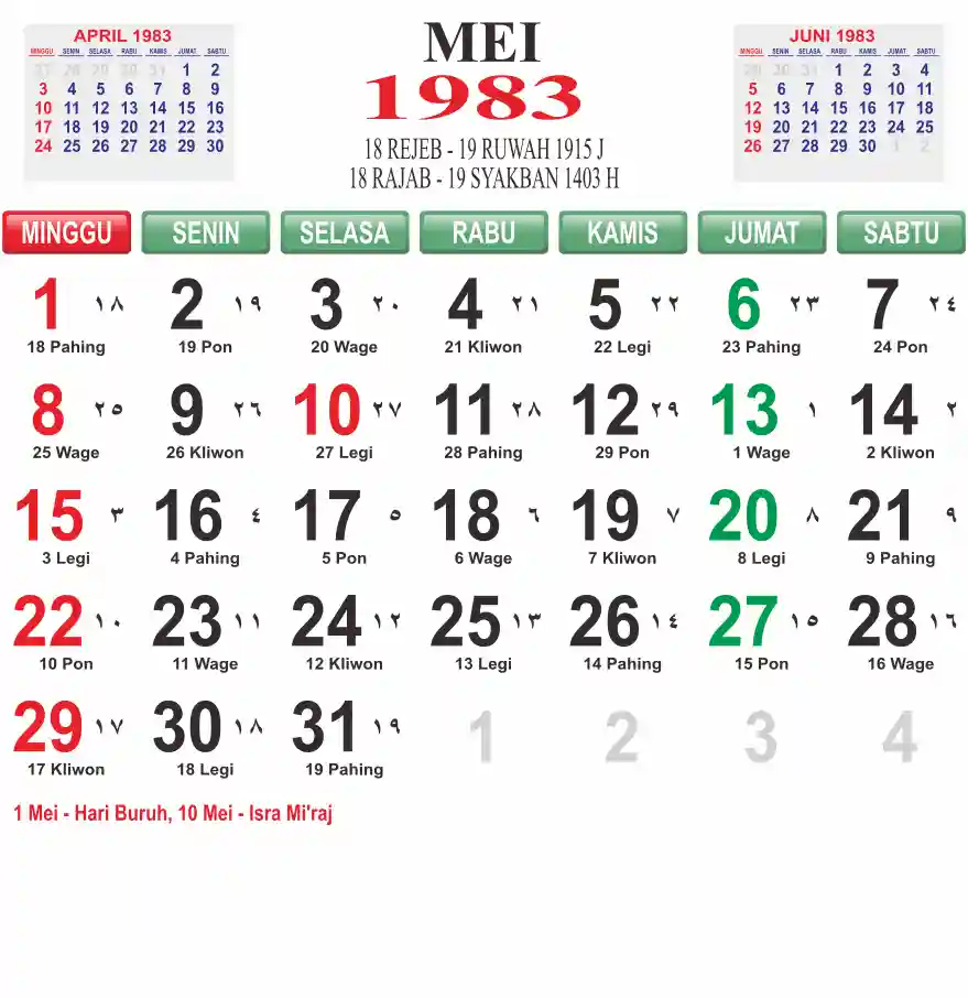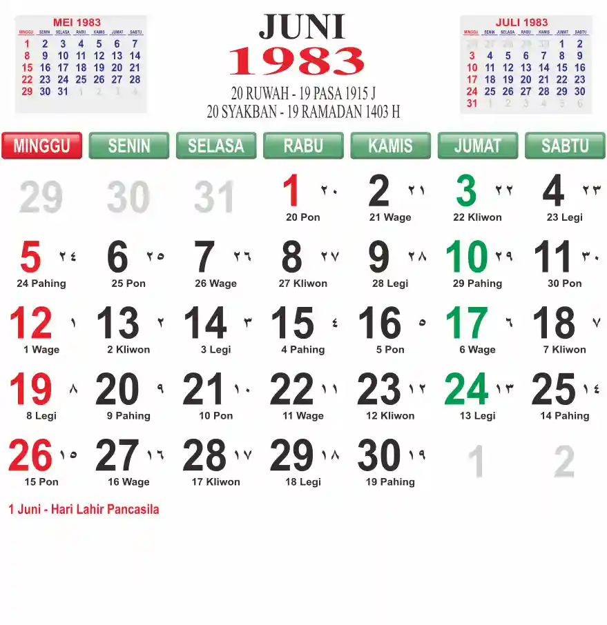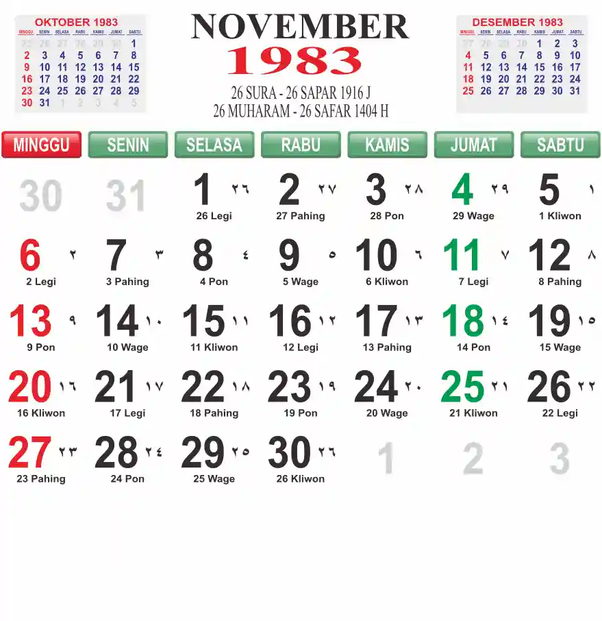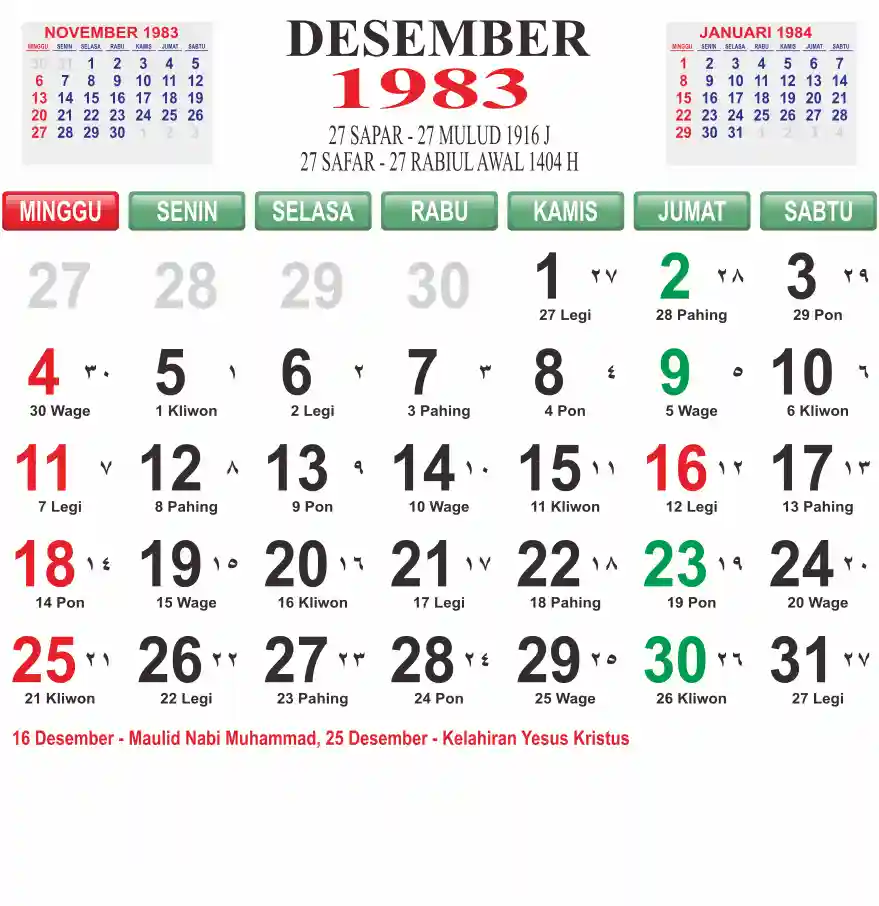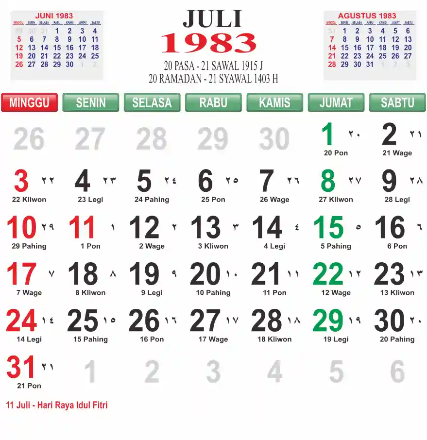 Template kalender 1983 lembaran besar jumbo yang mudah di baca dari jarak jauh. Kalender ini biasanya di cetak 1 lembar per bulan.