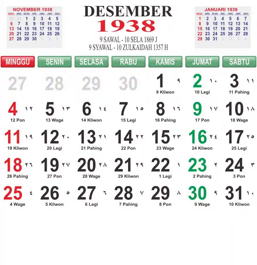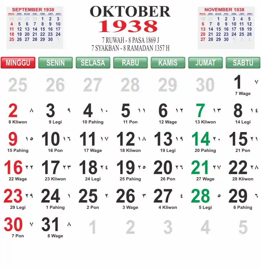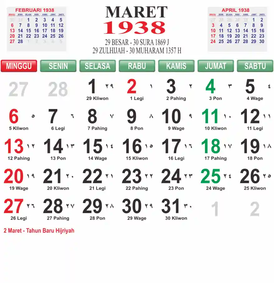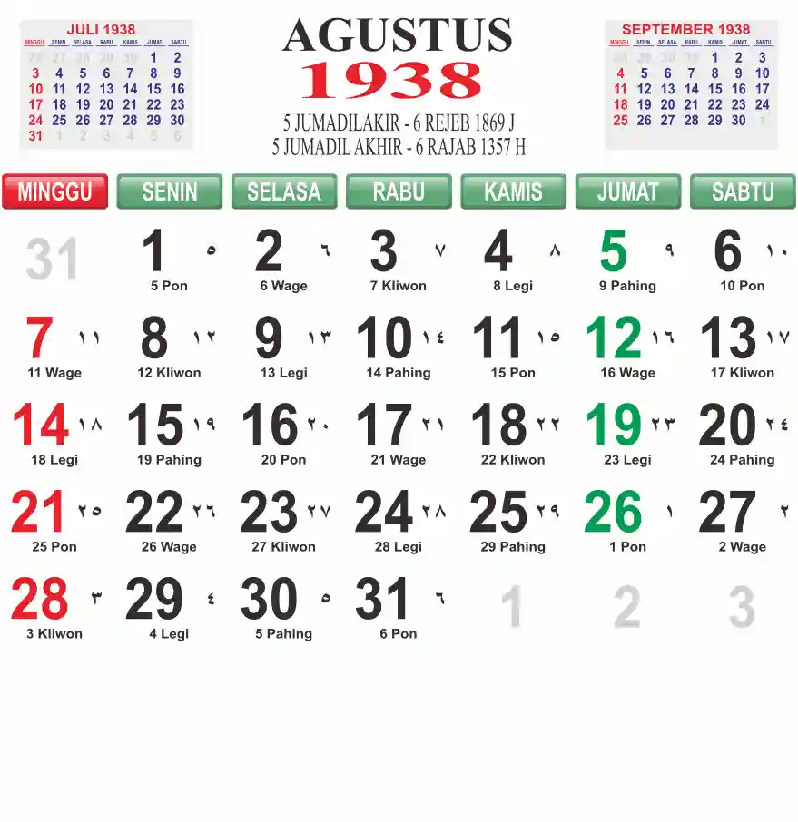 Template kalender 1938 lembaran besar jumbo yang mudah di baca dari jarak jauh. Kalender ini biasanya di cetak 1 lembar per bulan.