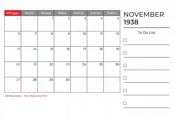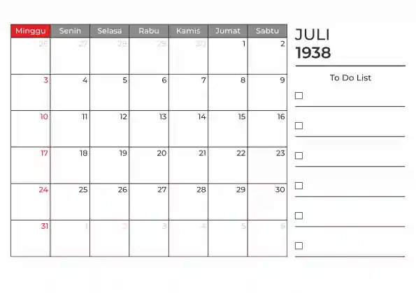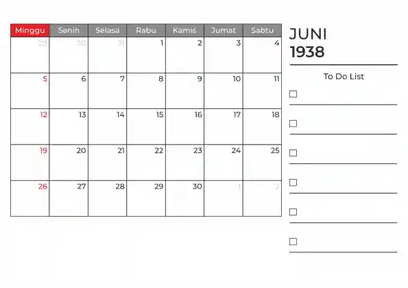Template kalender 1938 duduk planner. Ada space kosong yang bisa di isi untuk menulis catatan dan ada space untuk menulis to do list.