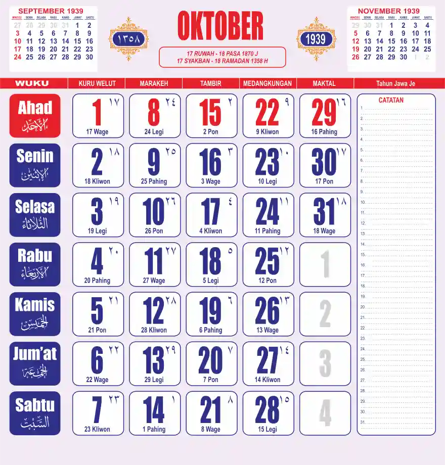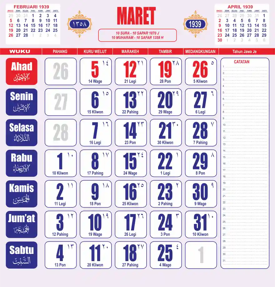 Template kalender 1939 lembaran besar jumbo yang sering dipakai oleh masyarakat jawa lengkap dengan wuku. Kalender ini biasanya di cetak 1 lembar per bulan.