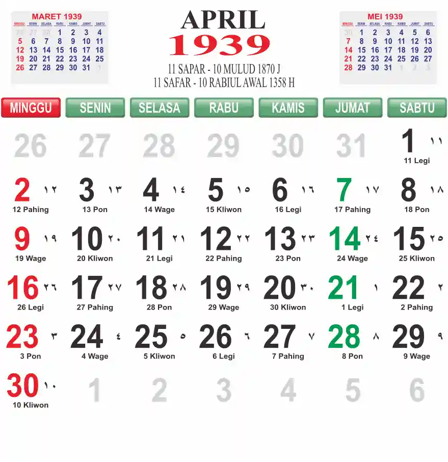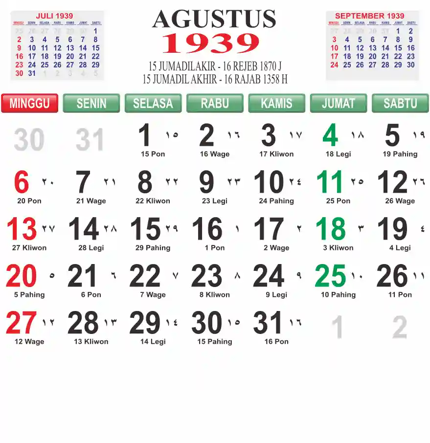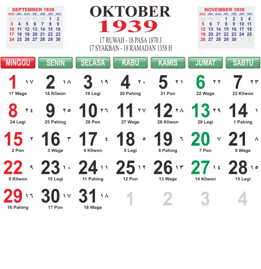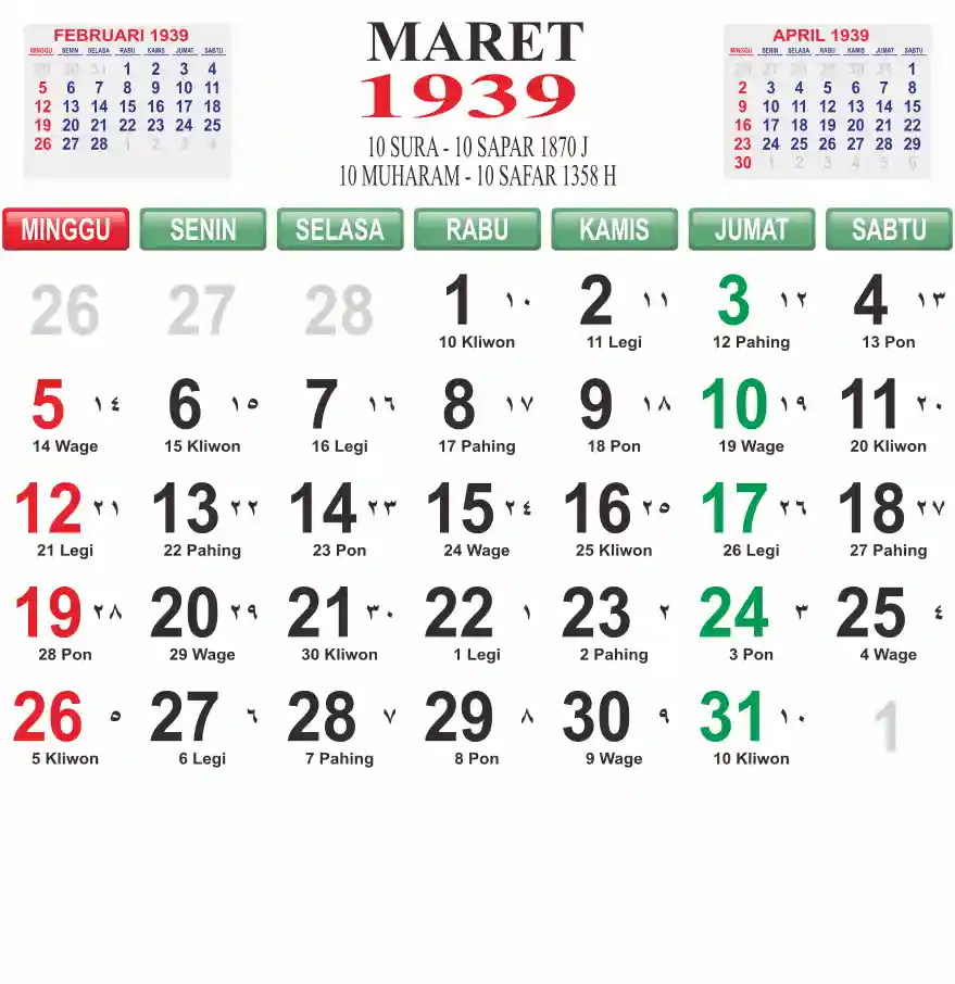 Template kalender 1939 lembaran besar jumbo yang mudah di baca dari jarak jauh. Kalender ini biasanya di cetak 1 lembar per bulan.