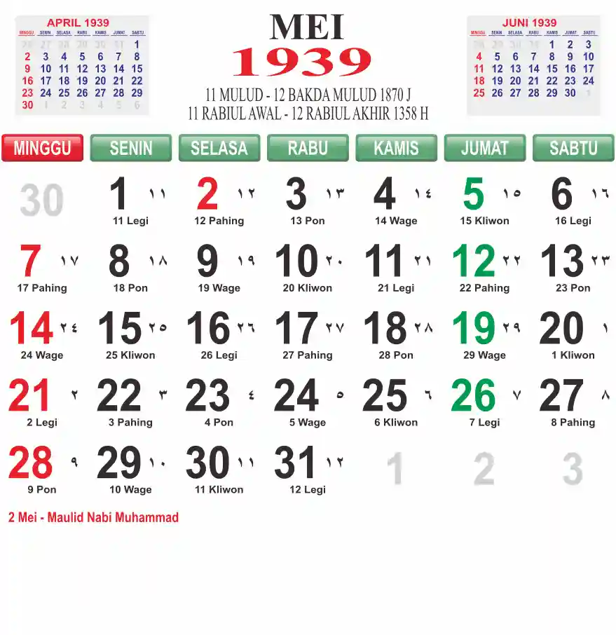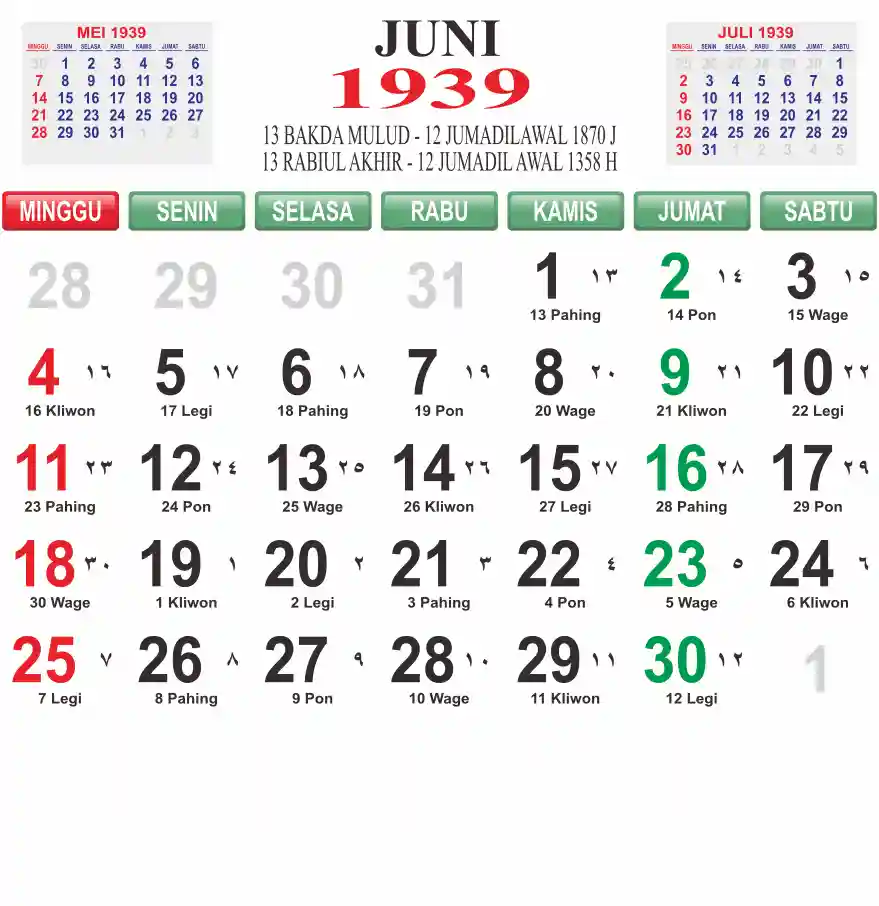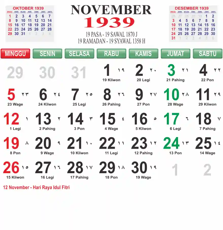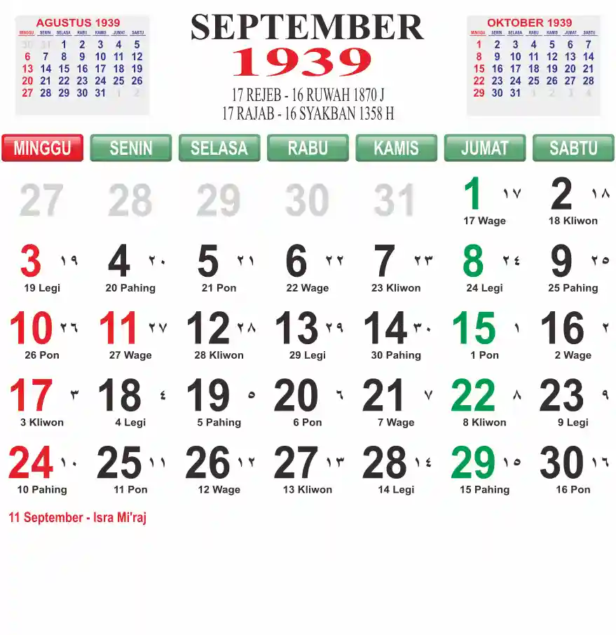 Template kalender 1939 lembaran besar jumbo yang mudah di baca dari jarak jauh. Kalender ini biasanya di cetak 1 lembar per bulan.