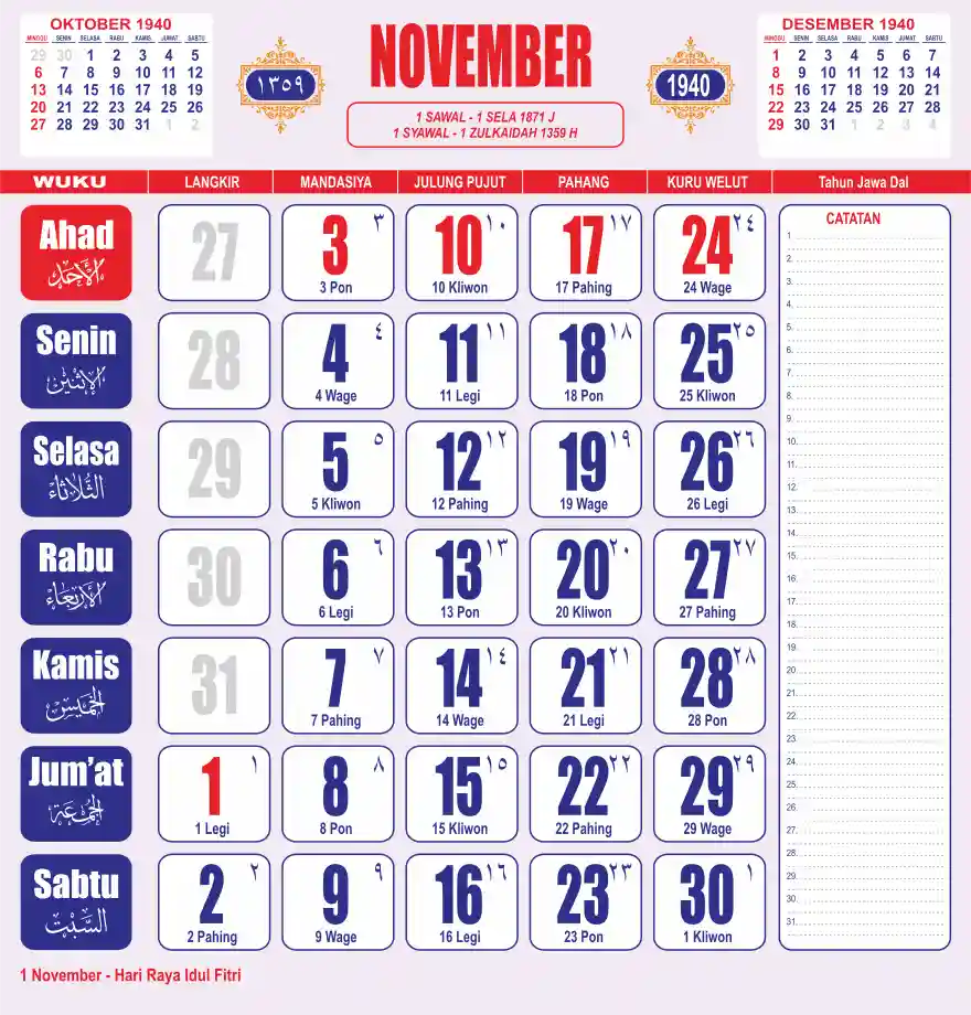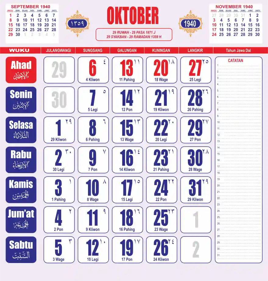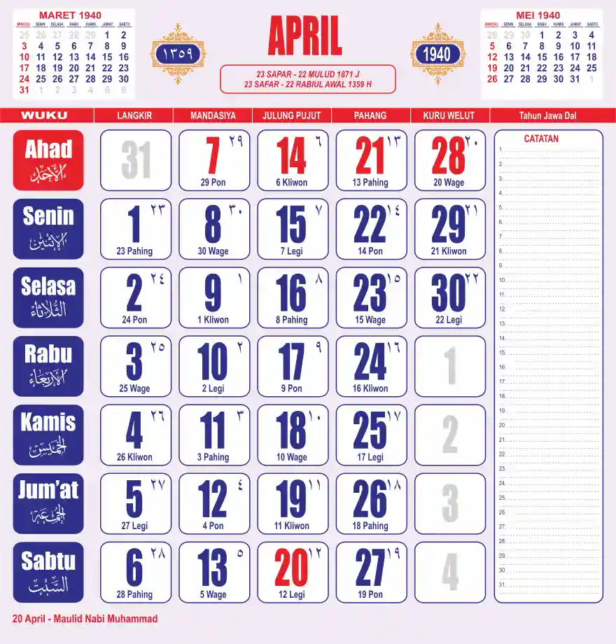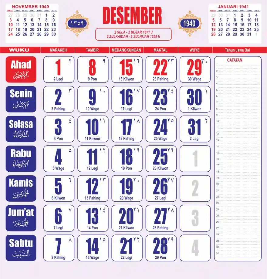 Template kalender 1940 lembaran besar jumbo yang sering dipakai oleh masyarakat jawa lengkap dengan wuku. Kalender ini biasanya di cetak 1 lembar per bulan.