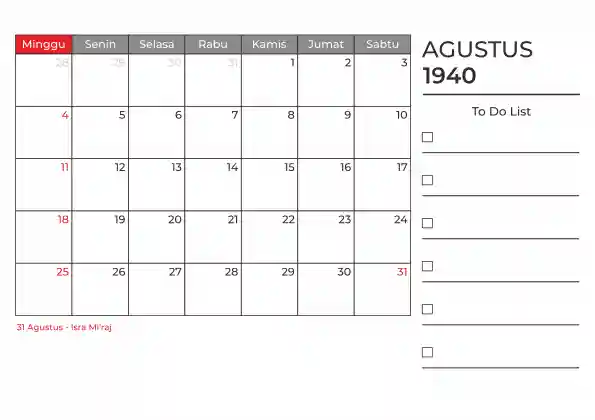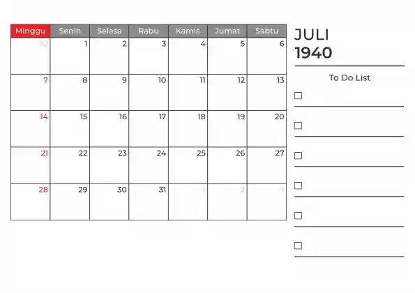 Template kalender 1940 duduk planner. Ada space kosong yang bisa di isi untuk menulis catatan dan ada space untuk menulis to do list.