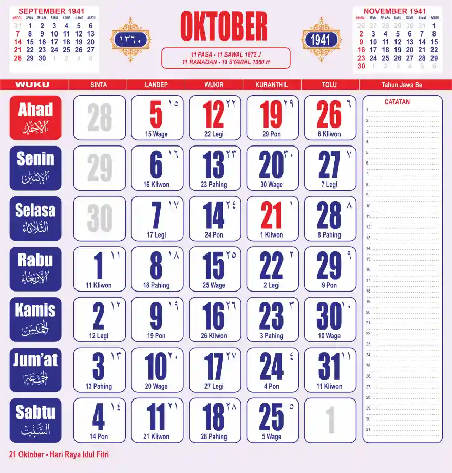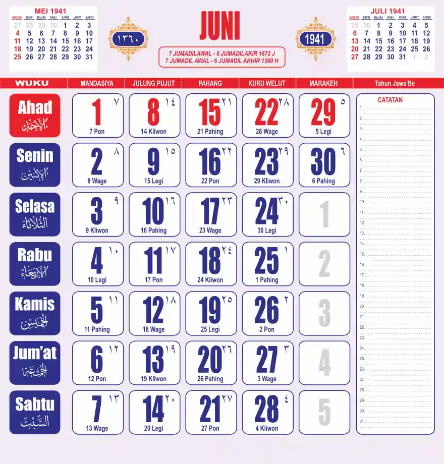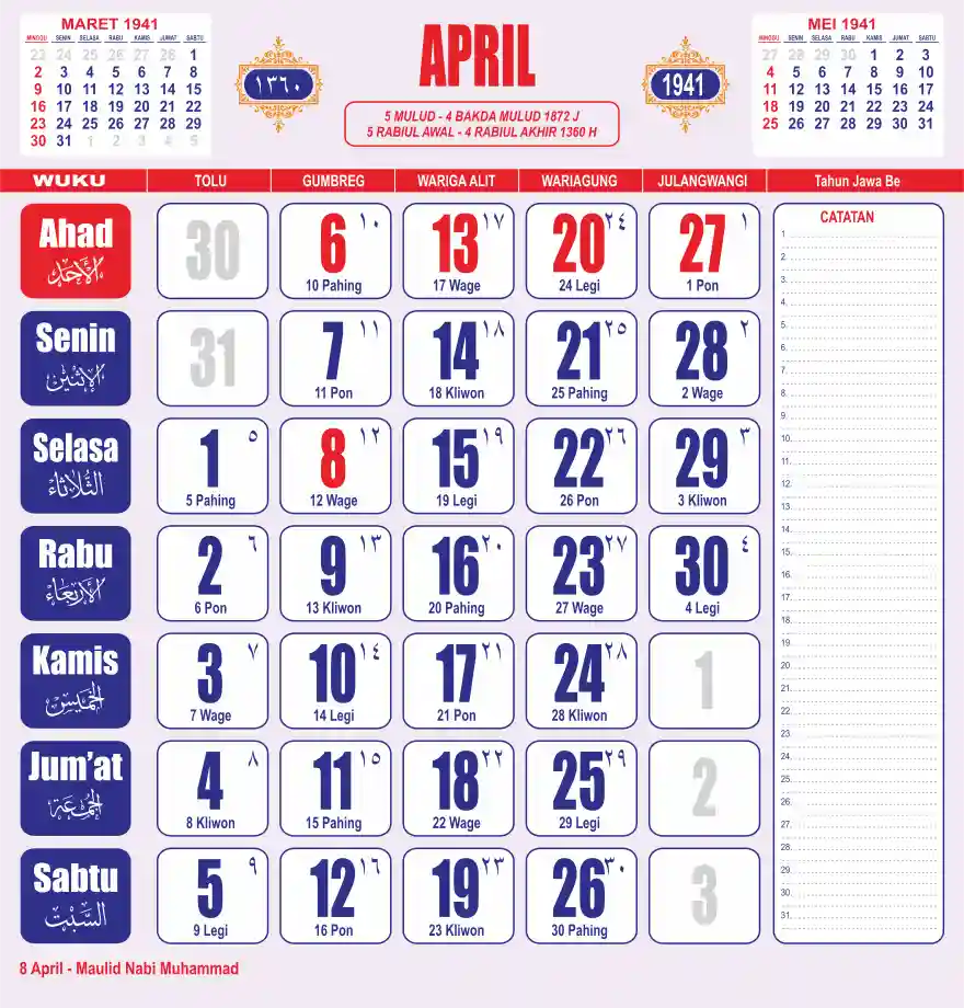 Template kalender 1941 lembaran besar jumbo yang sering dipakai oleh masyarakat jawa lengkap dengan wuku. Kalender ini biasanya di cetak 1 lembar per bulan.