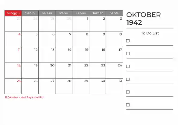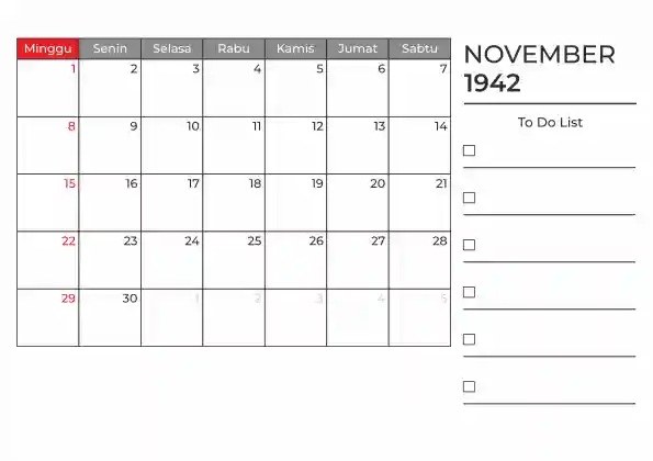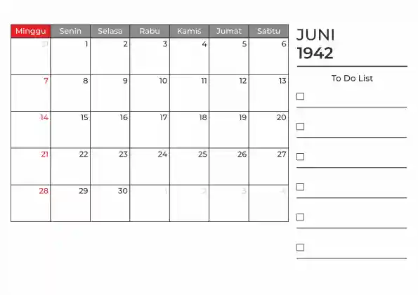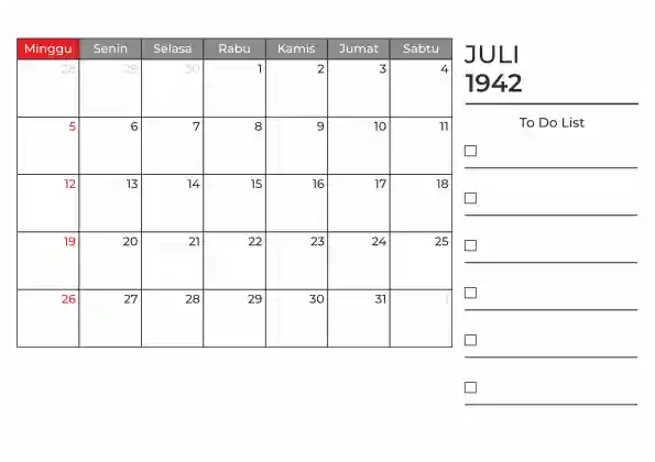 Template kalender 1942 duduk planner. Ada space kosong yang bisa di isi untuk menulis catatan dan ada space untuk menulis to do list.