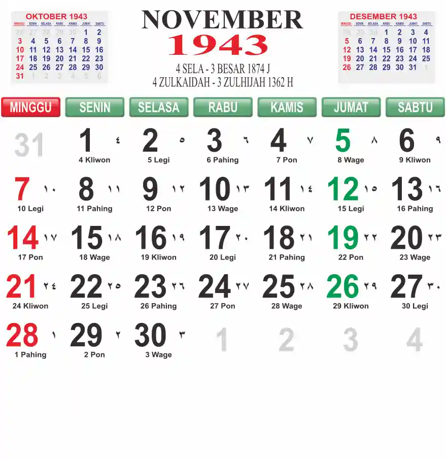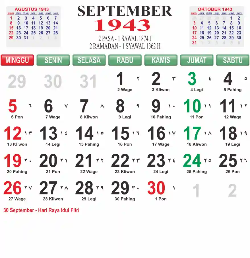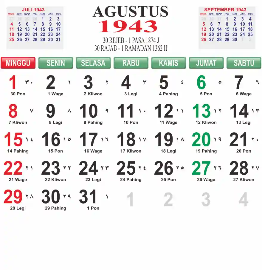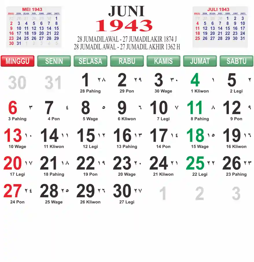 Template kalender 1943 lembaran besar jumbo yang mudah di baca dari jarak jauh. Kalender ini biasanya di cetak 1 lembar per bulan.