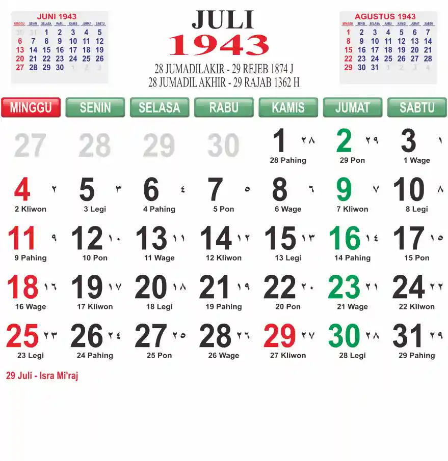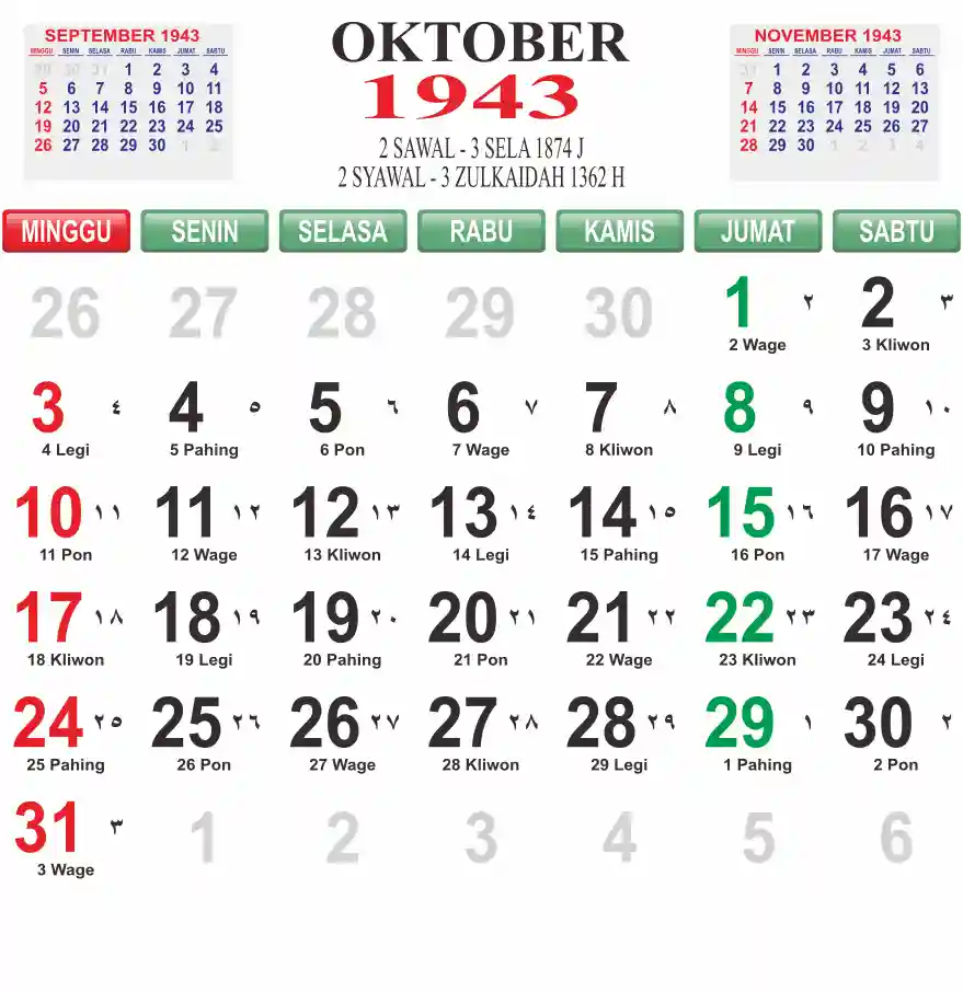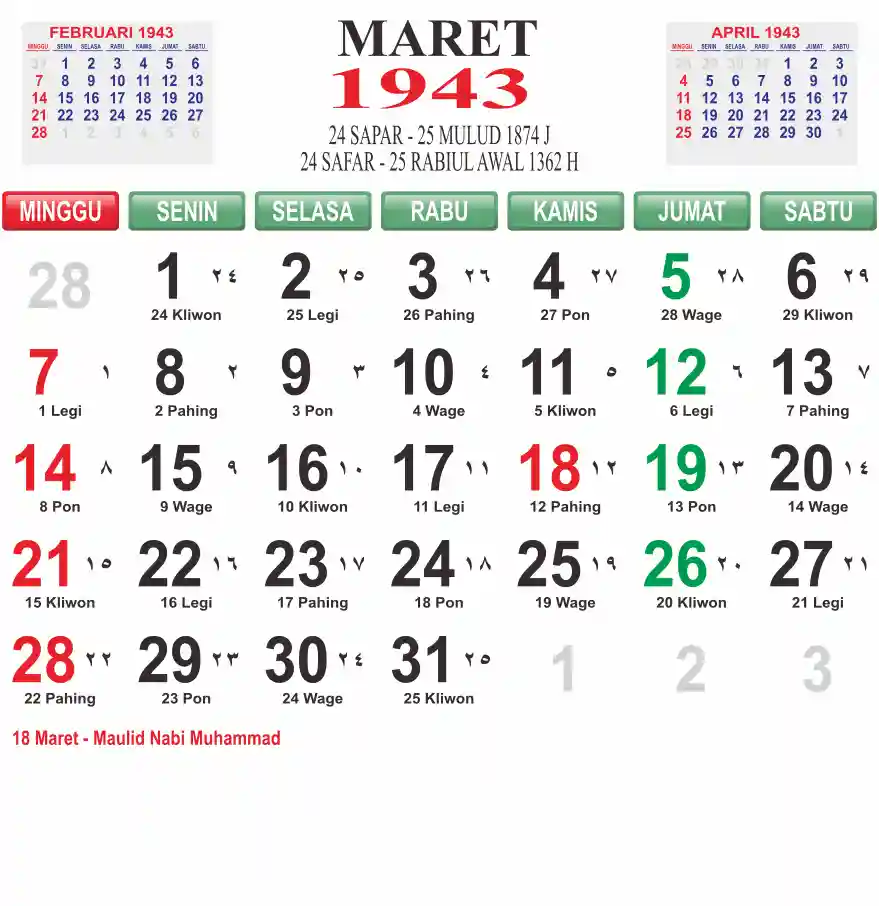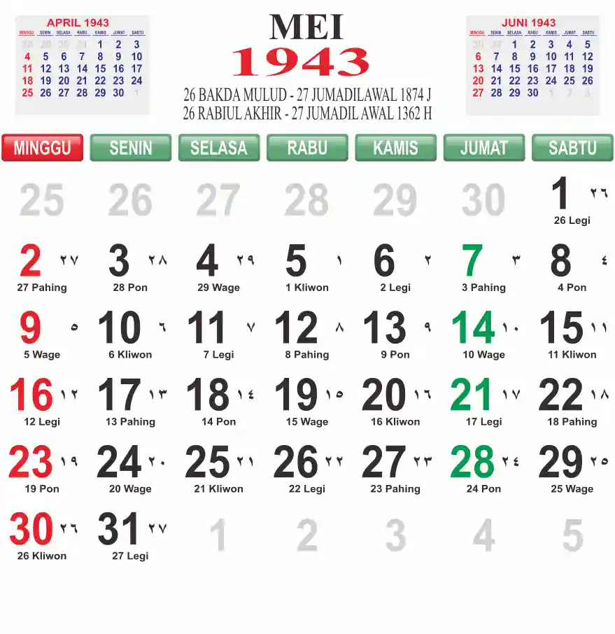 Template kalender 1943 lembaran besar jumbo yang mudah di baca dari jarak jauh. Kalender ini biasanya di cetak 1 lembar per bulan.
