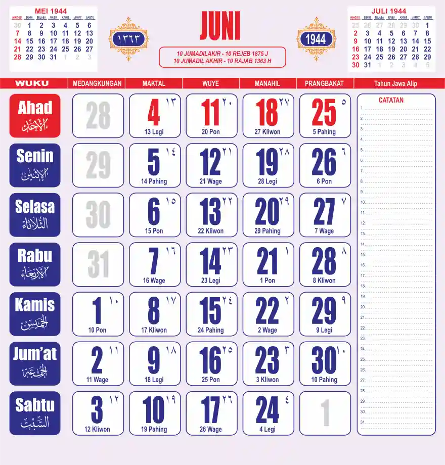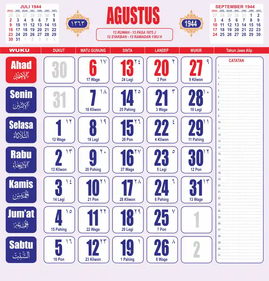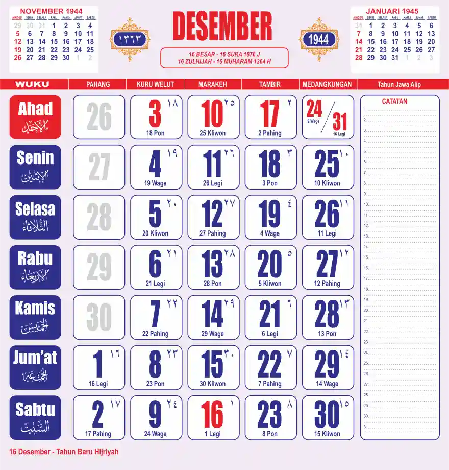 Template kalender 1944 lembaran besar jumbo yang sering dipakai oleh masyarakat jawa lengkap dengan wuku. Kalender ini biasanya di cetak 1 lembar per bulan.