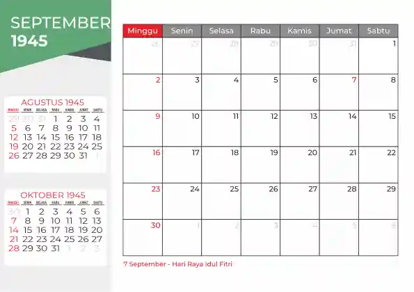 Template kalender 1945 duduk planner. Ada space kosong yang bisa di isi untuk menulis catatan. Fokus utama kalender ini adalah sebagia planner.