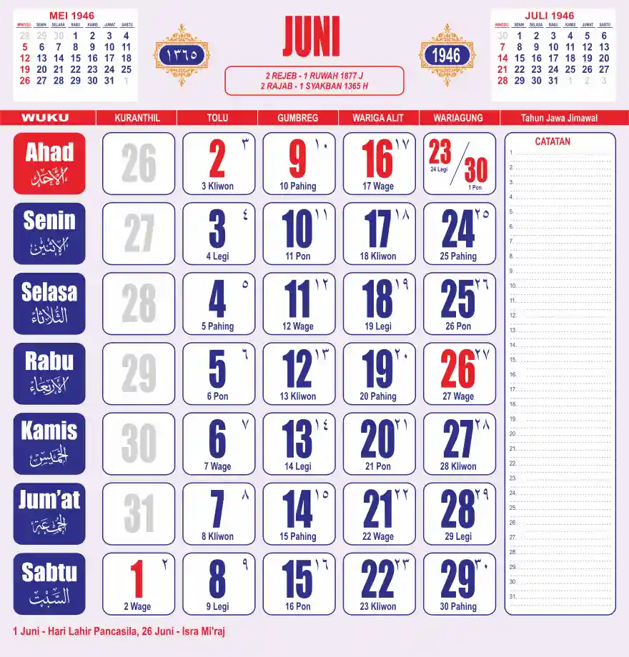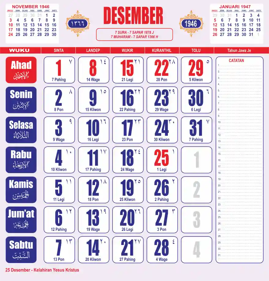 Template kalender 1946 lembaran besar jumbo yang sering dipakai oleh masyarakat jawa lengkap dengan wuku. Kalender ini biasanya di cetak 1 lembar per bulan.