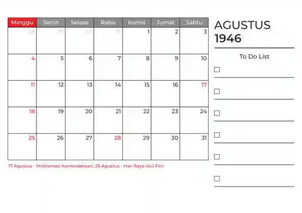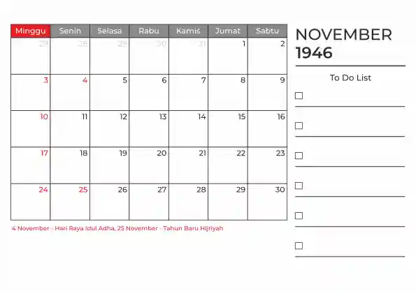 Template kalender 1946 duduk planner. Ada space kosong yang bisa di isi untuk menulis catatan dan ada space untuk menulis to do list.