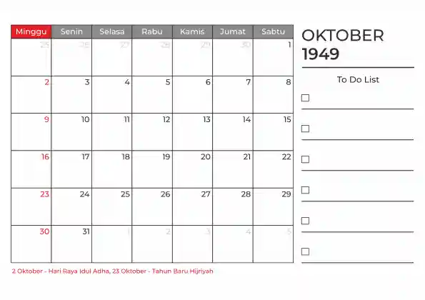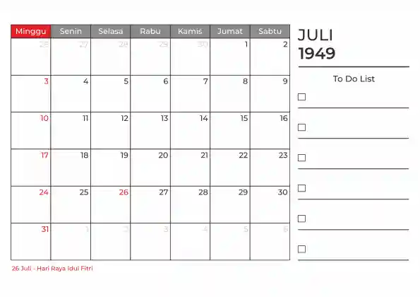 Template kalender 1949 duduk planner. Ada space kosong yang bisa di isi untuk menulis catatan dan ada space untuk menulis to do list.