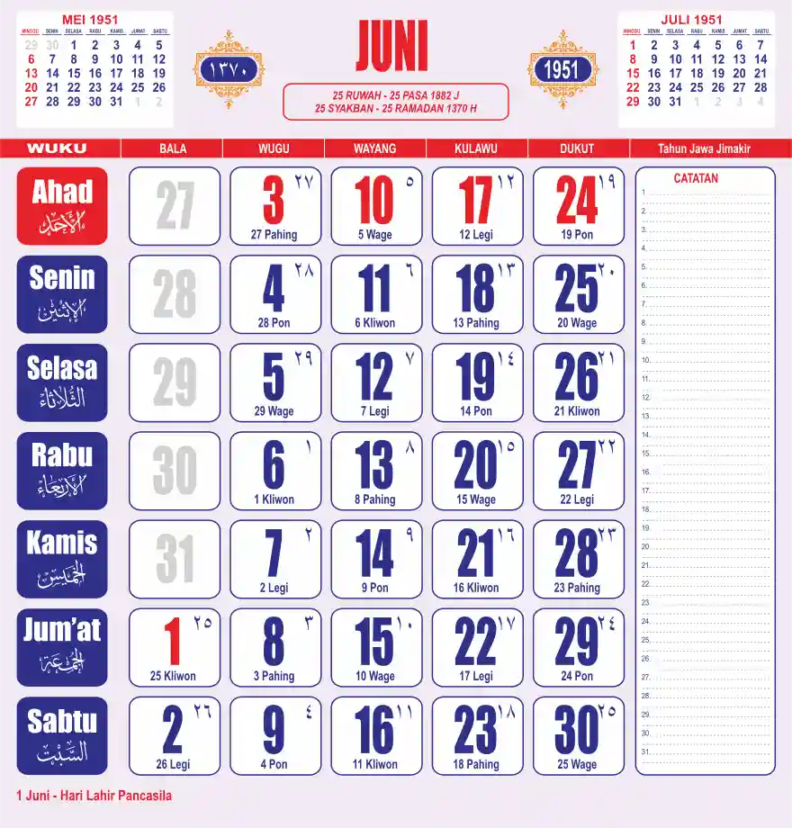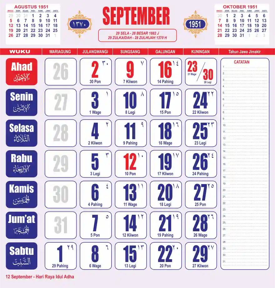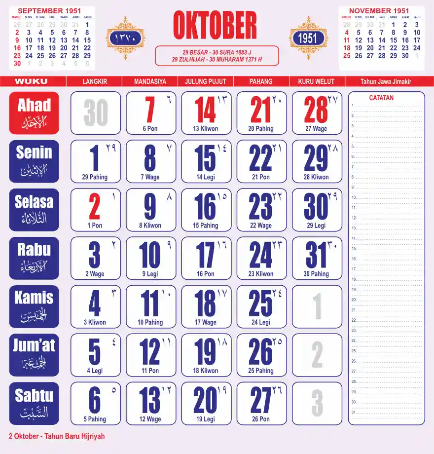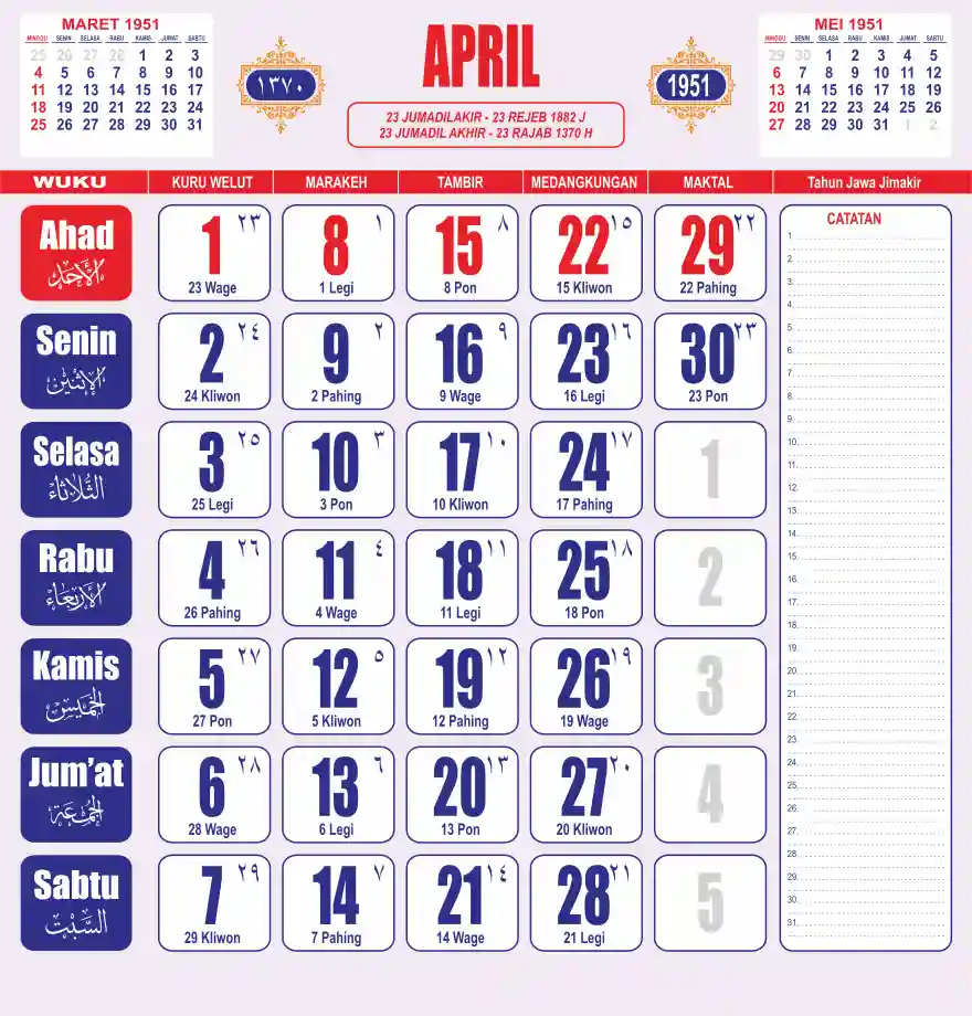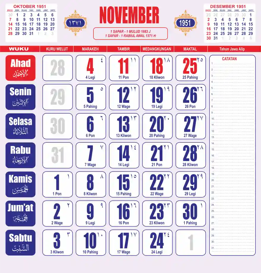 Template kalender 1951 lembaran besar jumbo yang sering dipakai oleh masyarakat jawa lengkap dengan wuku. Kalender ini biasanya di cetak 1 lembar per bulan.
