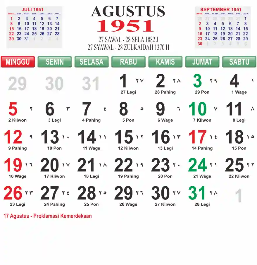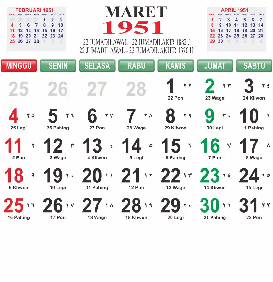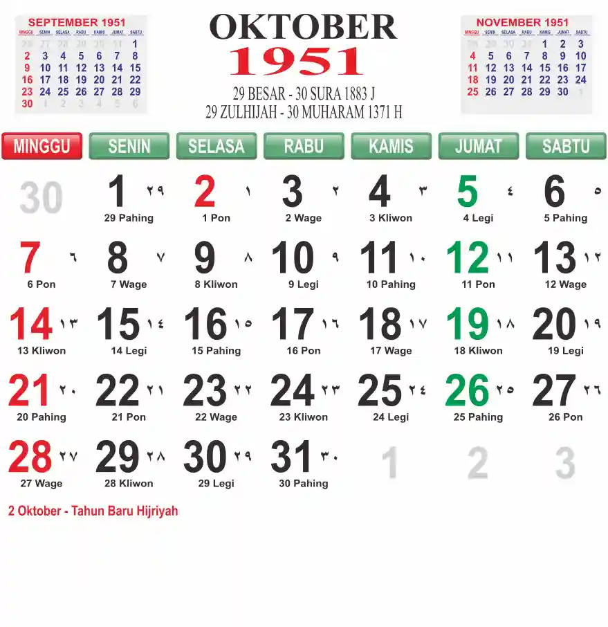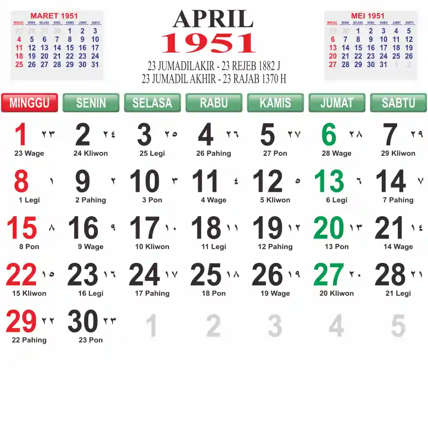 Template kalender 1951 lembaran besar jumbo yang mudah di baca dari jarak jauh. Kalender ini biasanya di cetak 1 lembar per bulan.