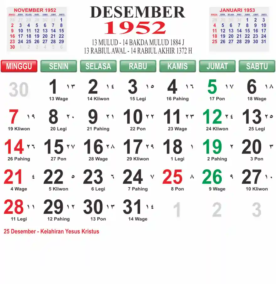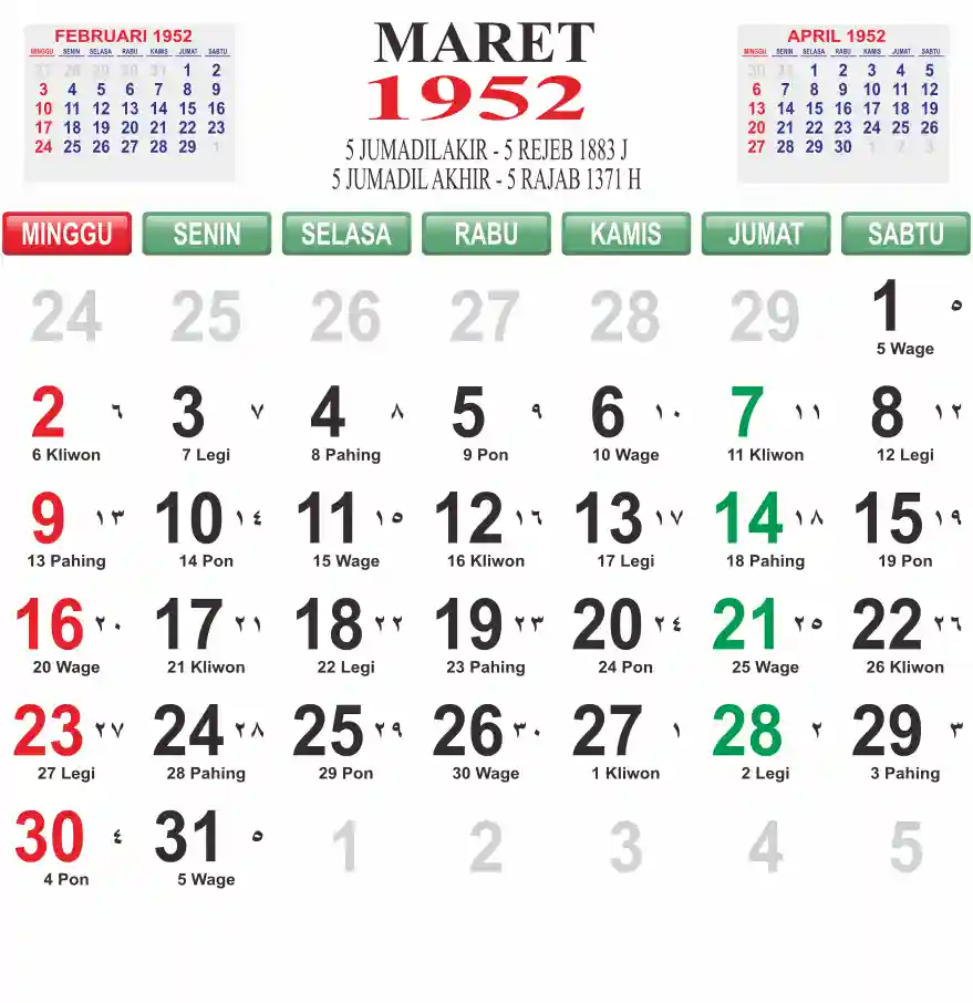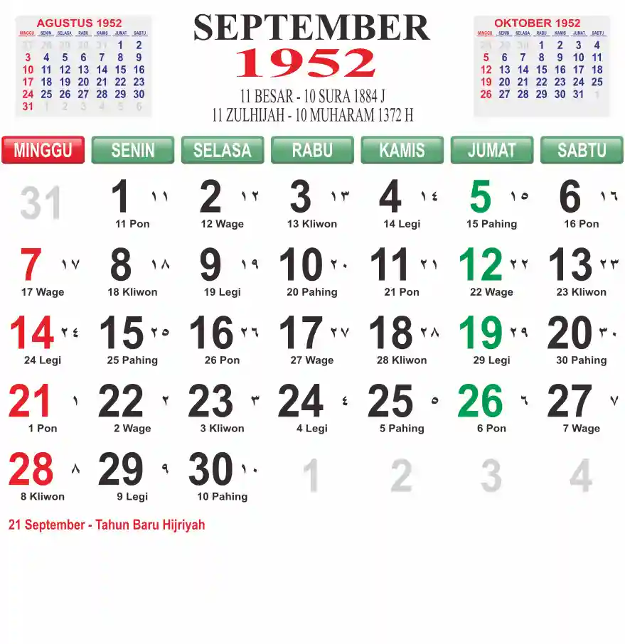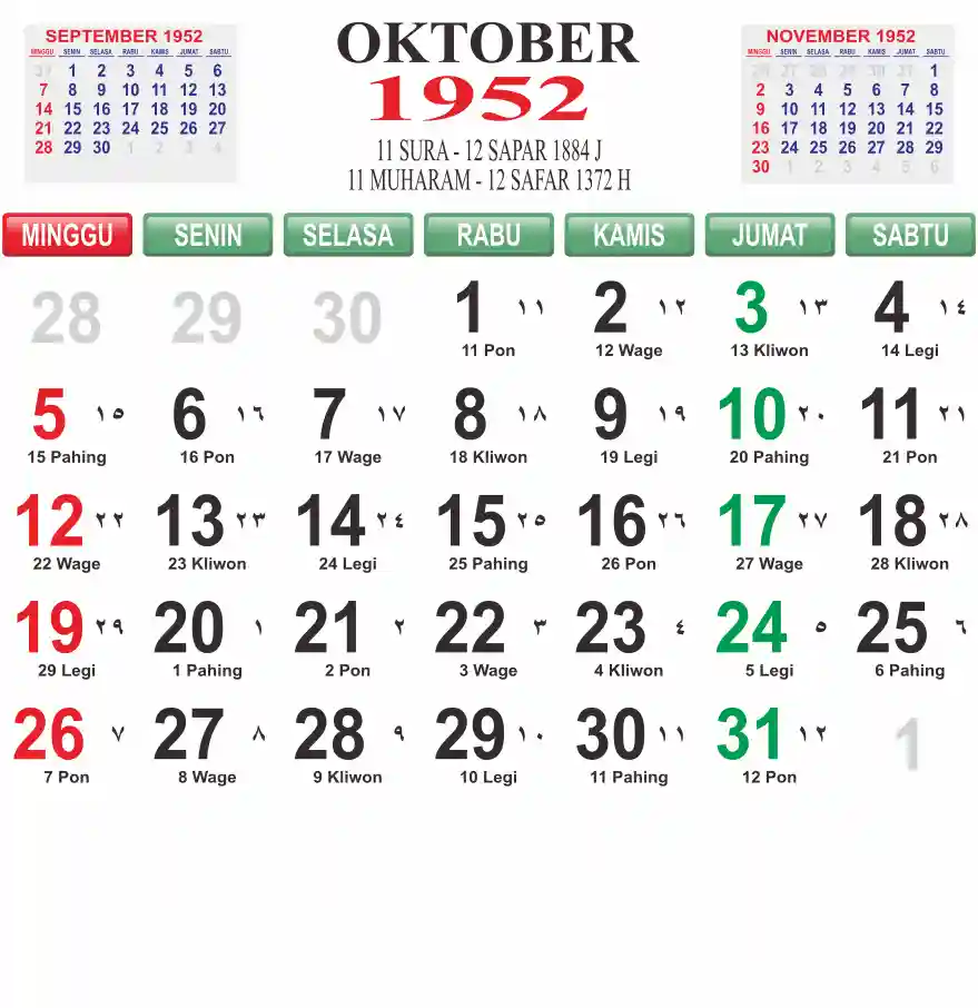 Template kalender 1952 lembaran besar jumbo yang mudah di baca dari jarak jauh. Kalender ini biasanya di cetak 1 lembar per bulan.