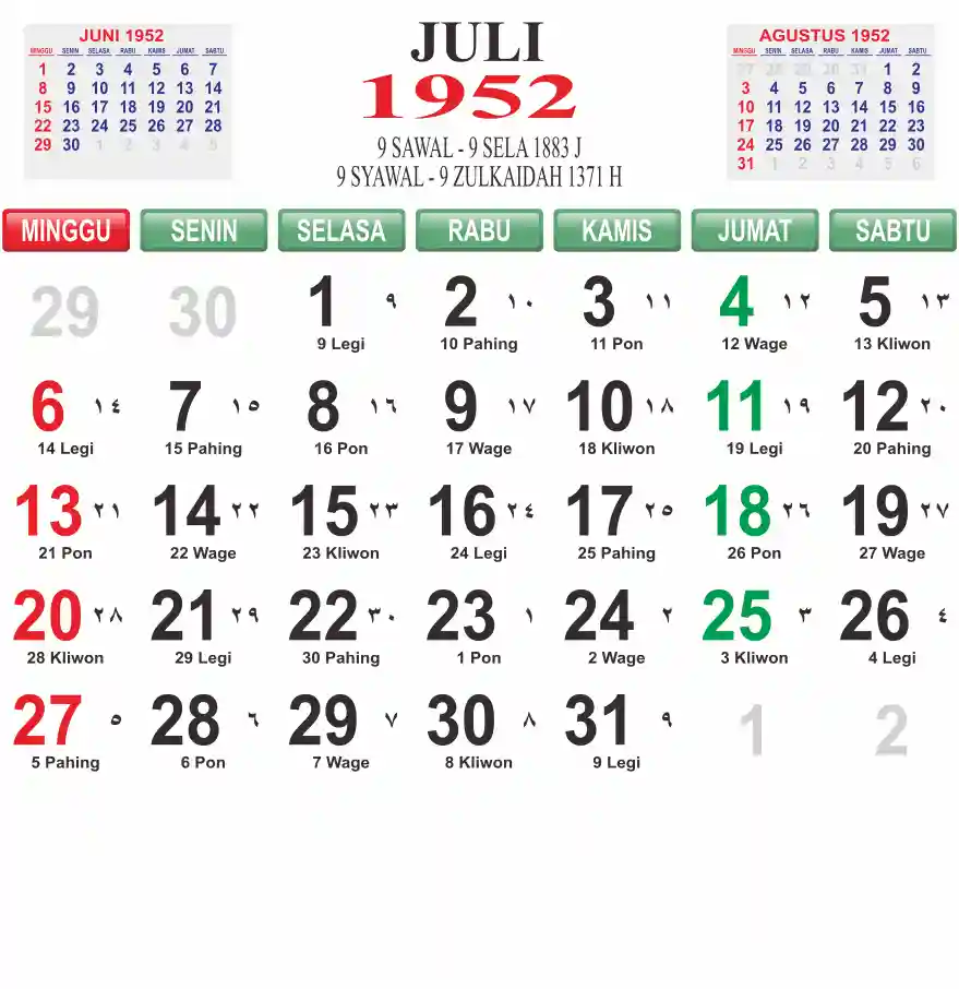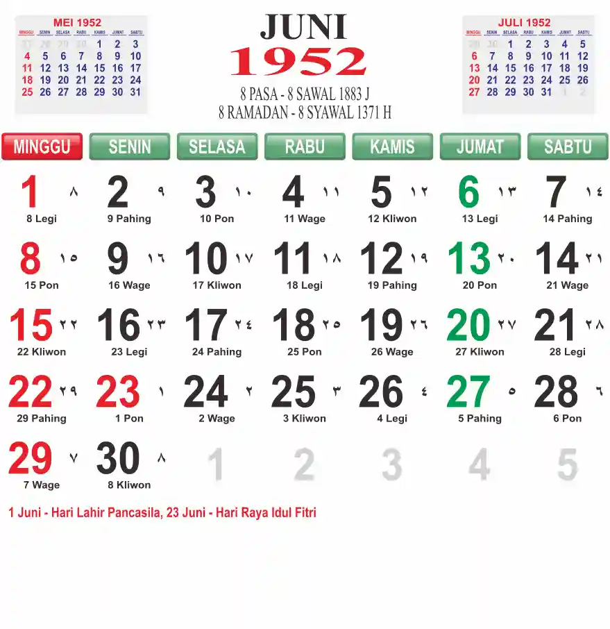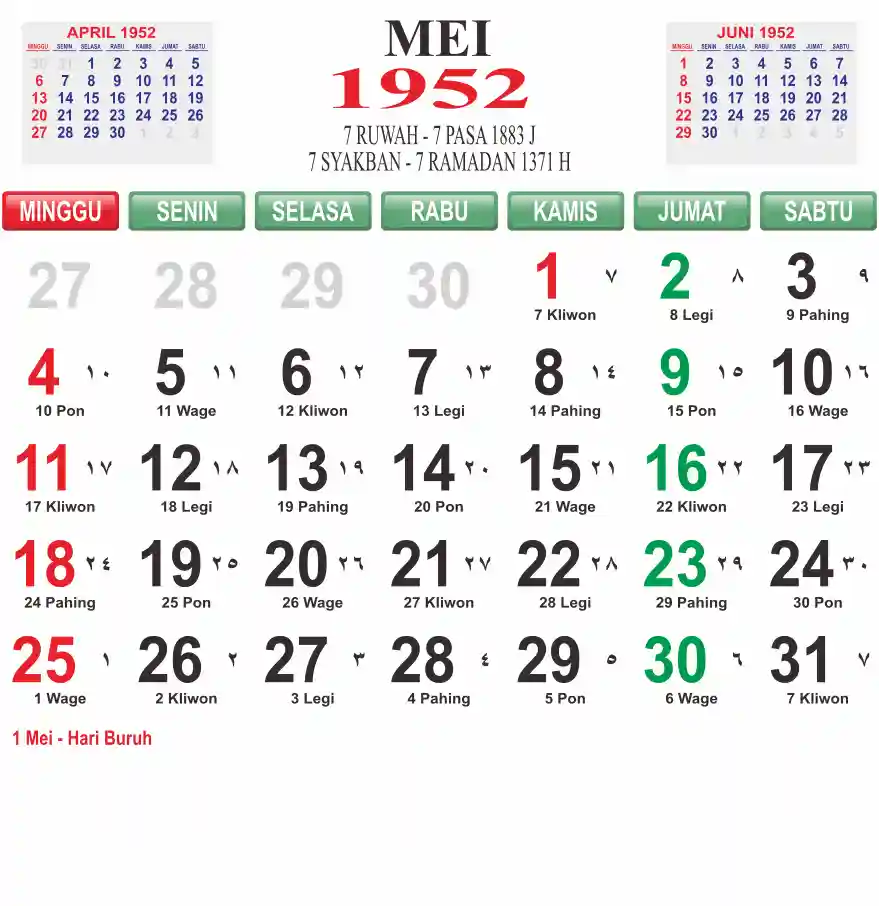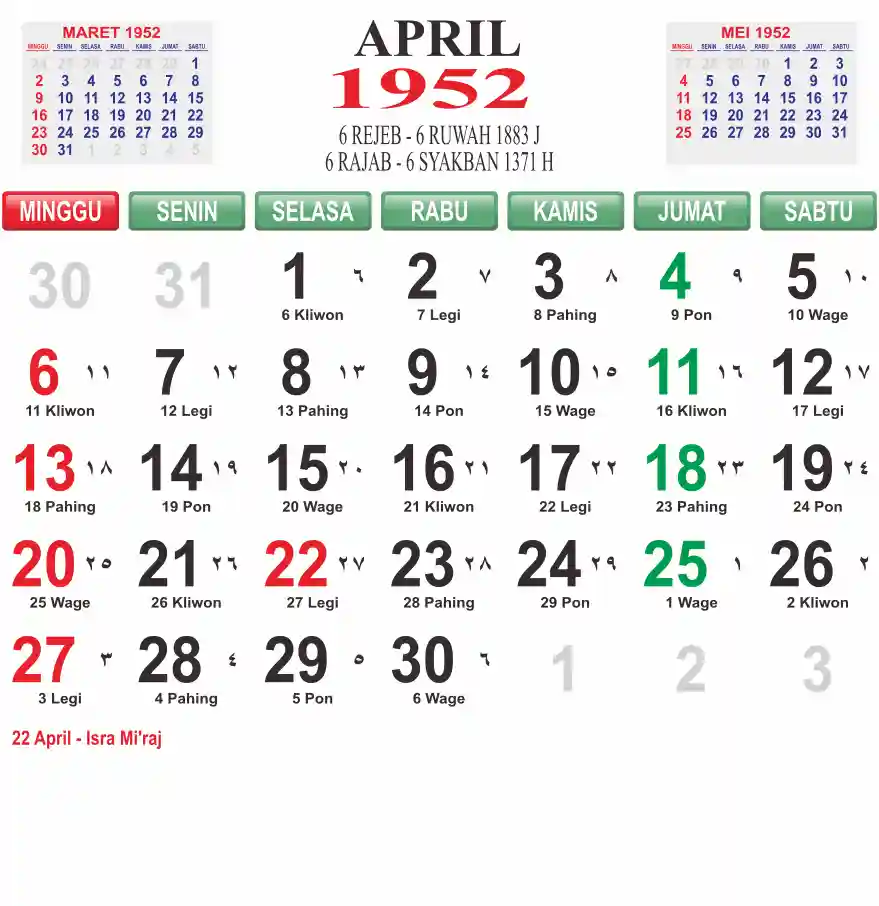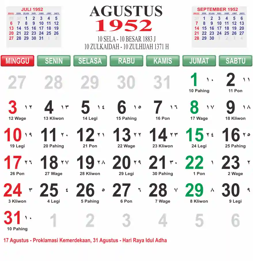 Template kalender 1952 lembaran besar jumbo yang mudah di baca dari jarak jauh. Kalender ini biasanya di cetak 1 lembar per bulan.