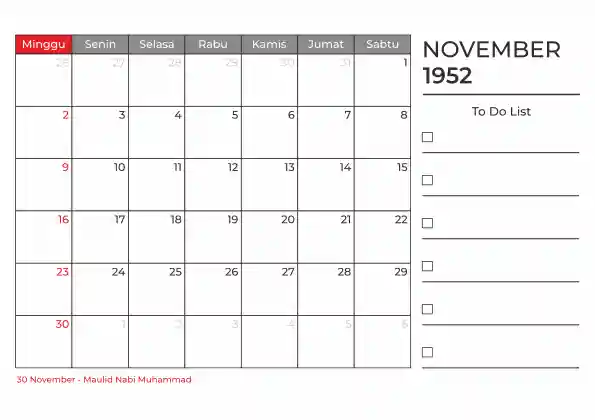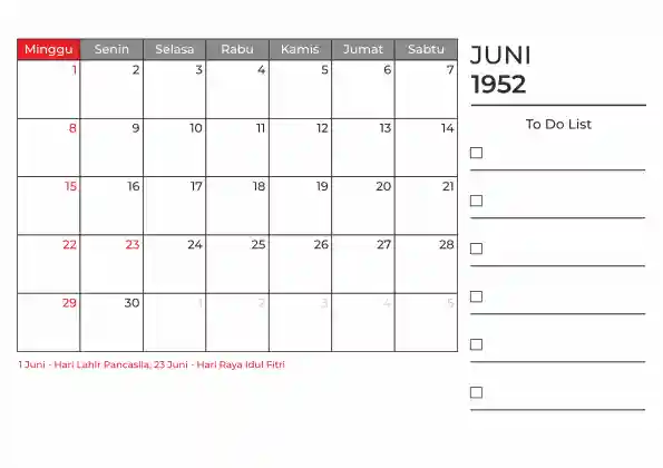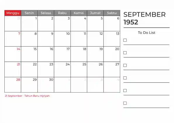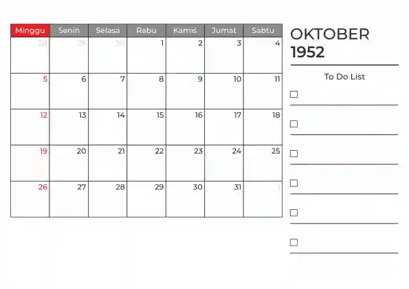 Template kalender 1952 duduk planner. Ada space kosong yang bisa di isi untuk menulis catatan dan ada space untuk menulis to do list.