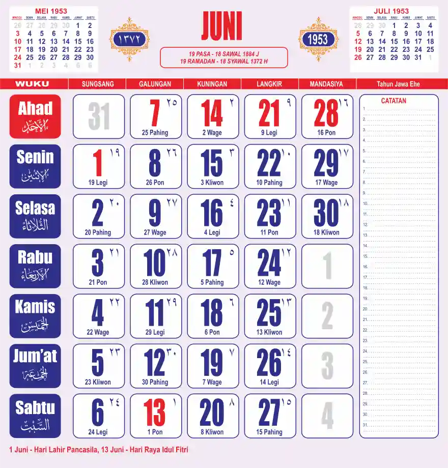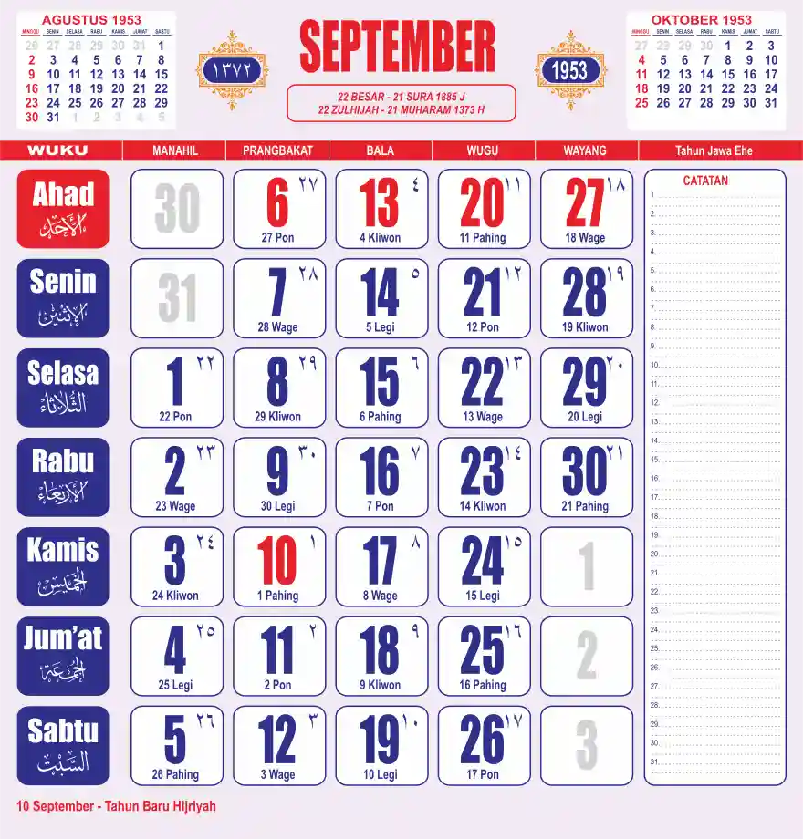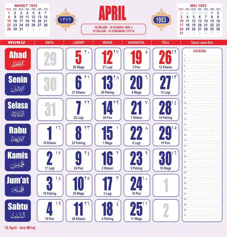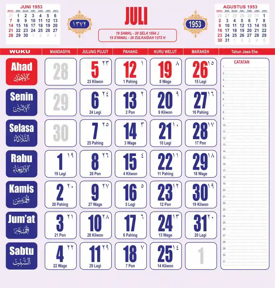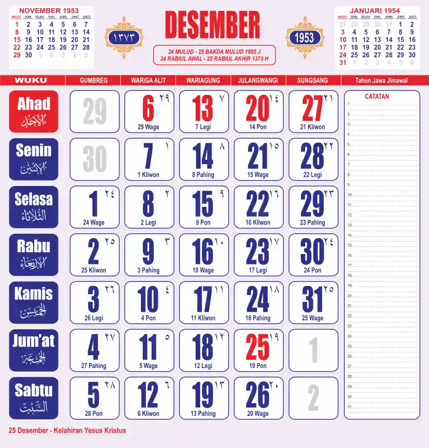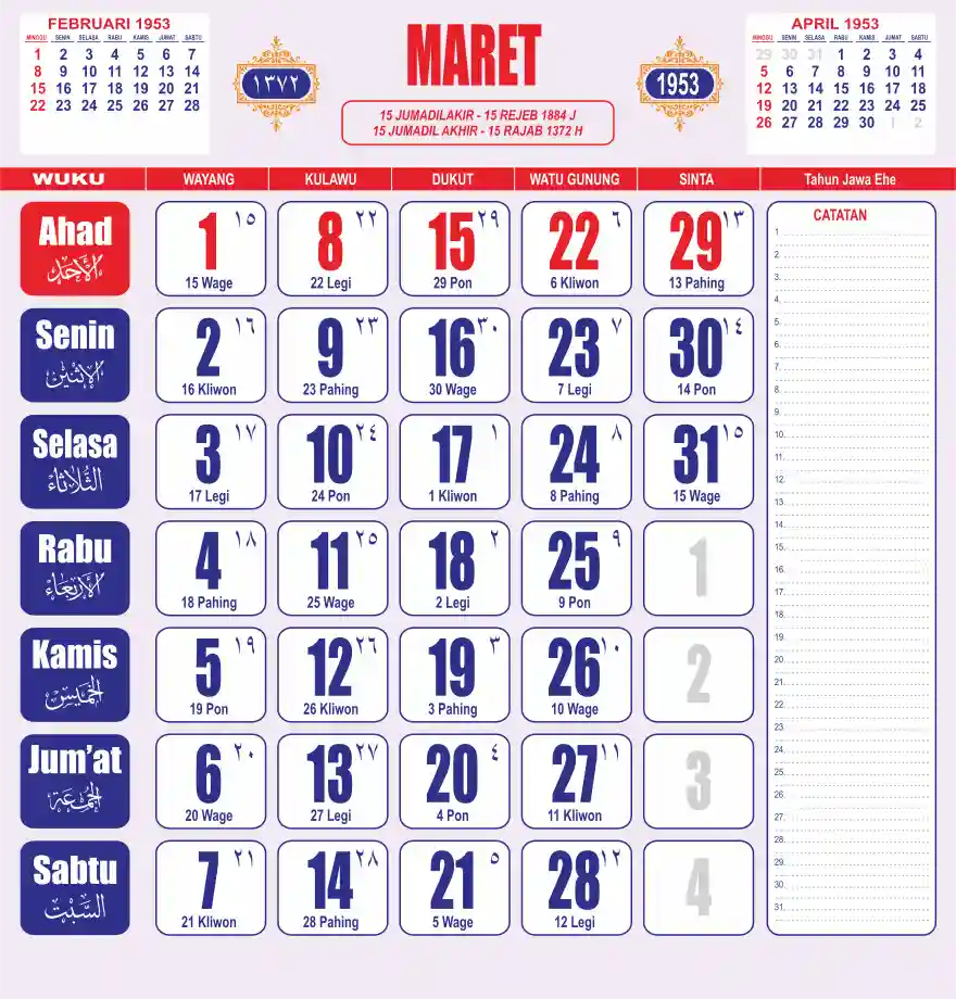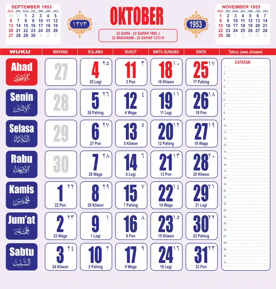 Template kalender 1953 lembaran besar jumbo yang sering dipakai oleh masyarakat jawa lengkap dengan wuku. Kalender ini biasanya di cetak 1 lembar per bulan.
