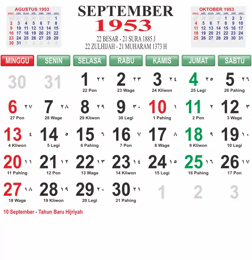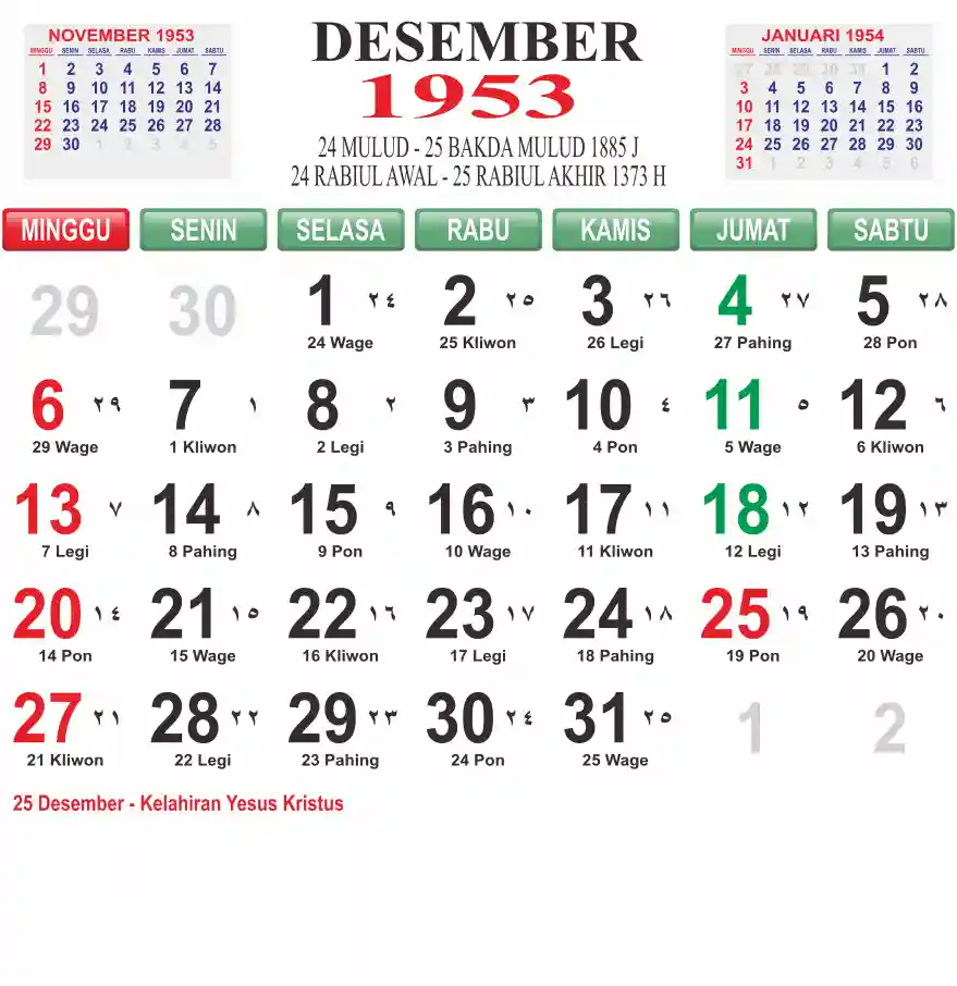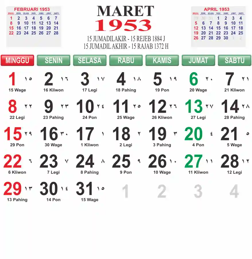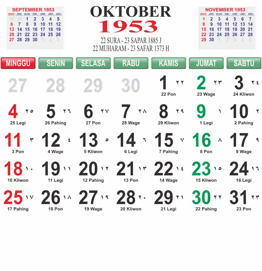 Template kalender 1953 lembaran besar jumbo yang mudah di baca dari jarak jauh. Kalender ini biasanya di cetak 1 lembar per bulan.