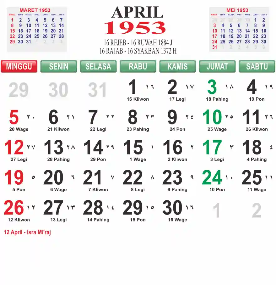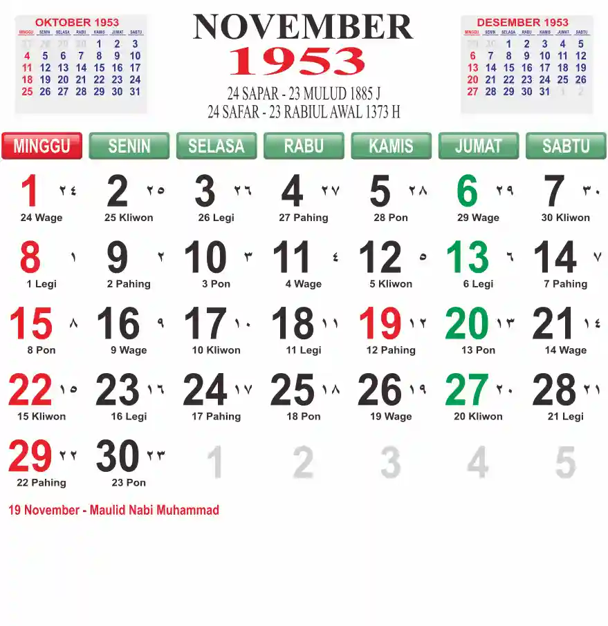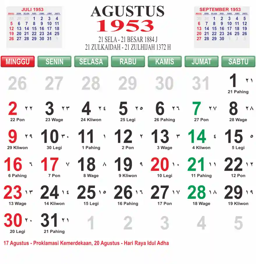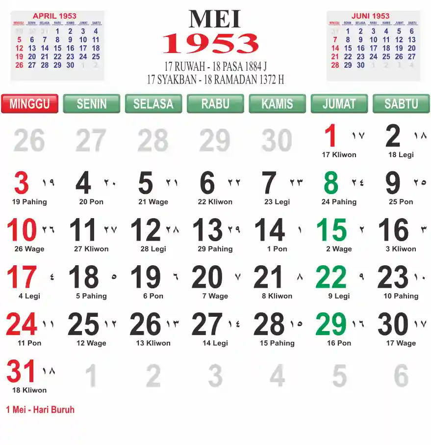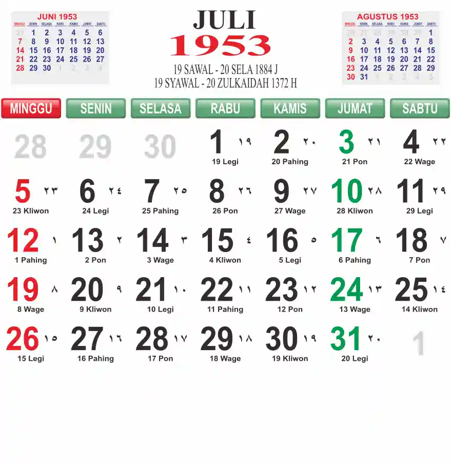 Template kalender 1953 lembaran besar jumbo yang mudah di baca dari jarak jauh. Kalender ini biasanya di cetak 1 lembar per bulan.