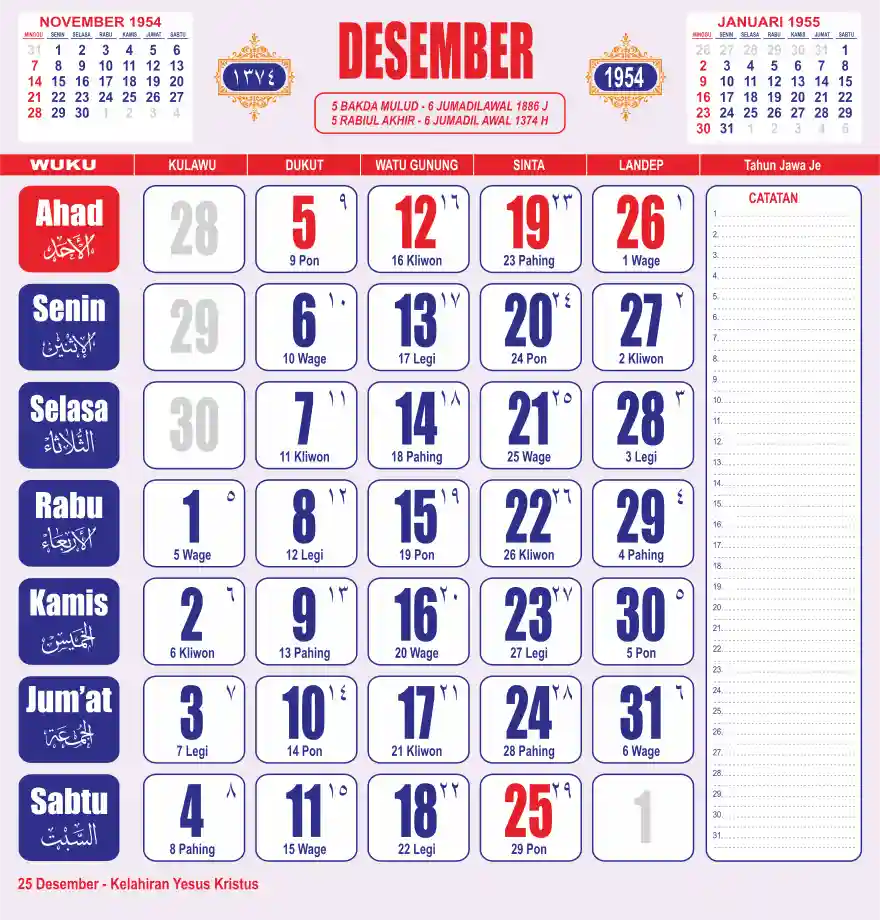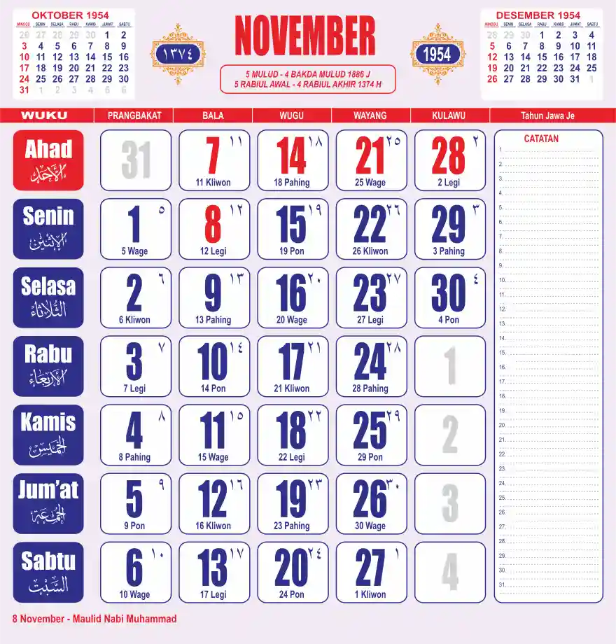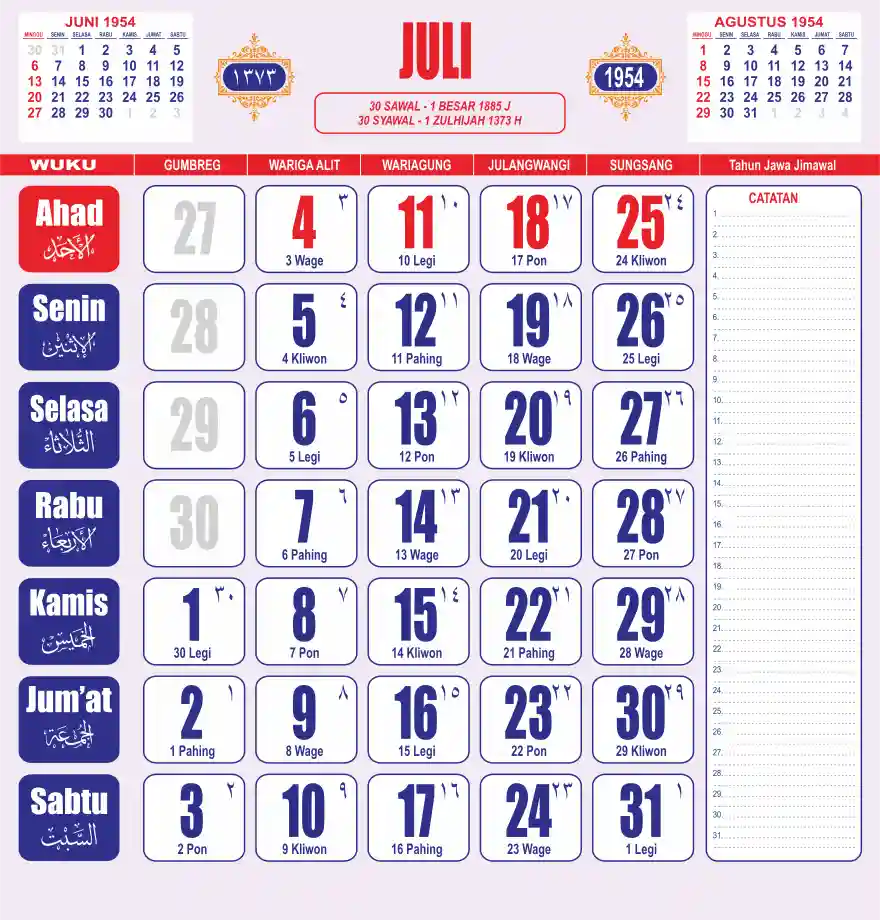 Template kalender 1954 lembaran besar jumbo yang sering dipakai oleh masyarakat jawa lengkap dengan wuku. Kalender ini biasanya di cetak 1 lembar per bulan.