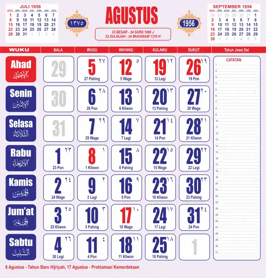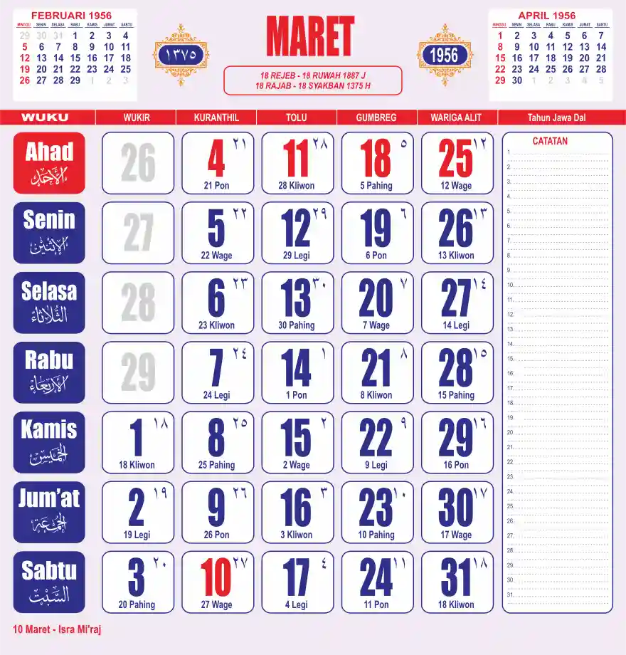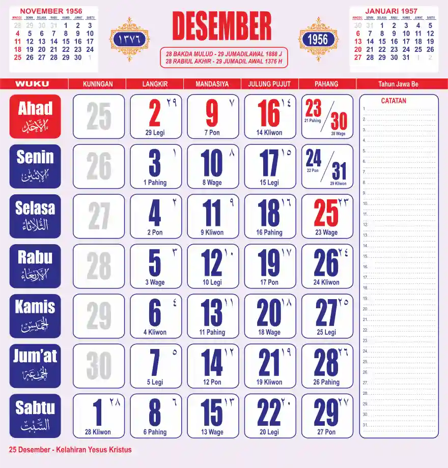 Template kalender 1956 lembaran besar jumbo yang sering dipakai oleh masyarakat jawa lengkap dengan wuku. Kalender ini biasanya di cetak 1 lembar per bulan.