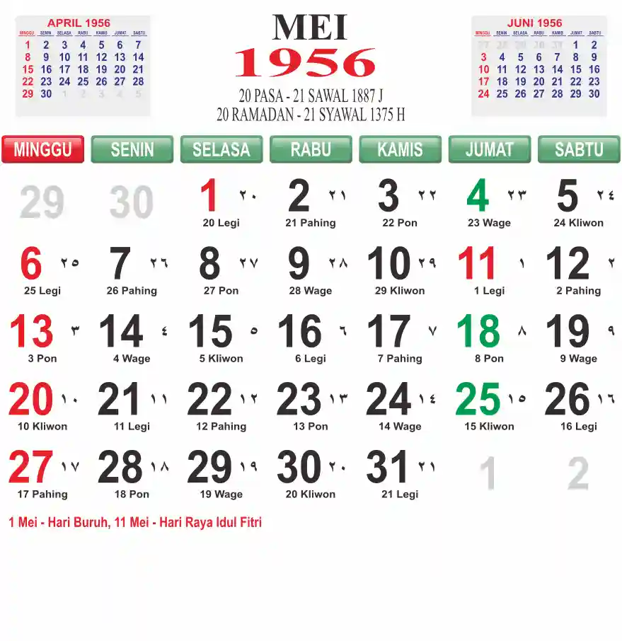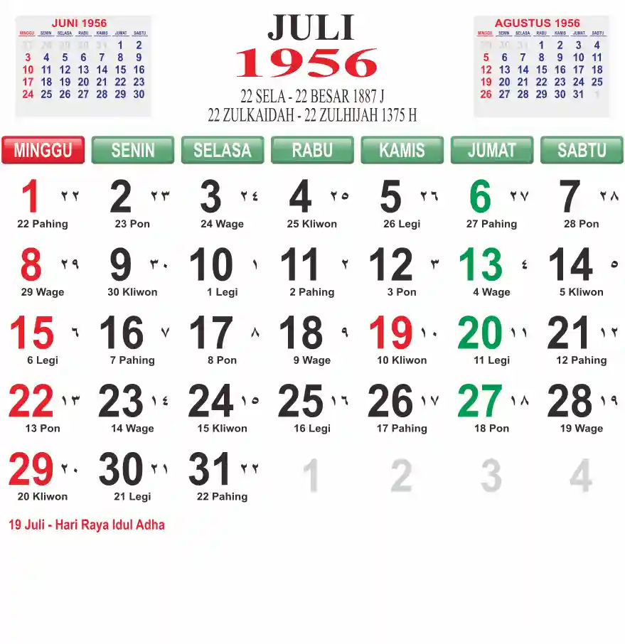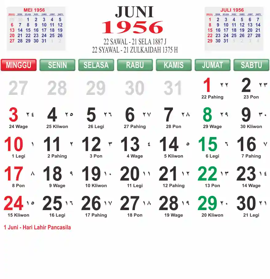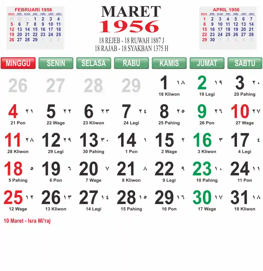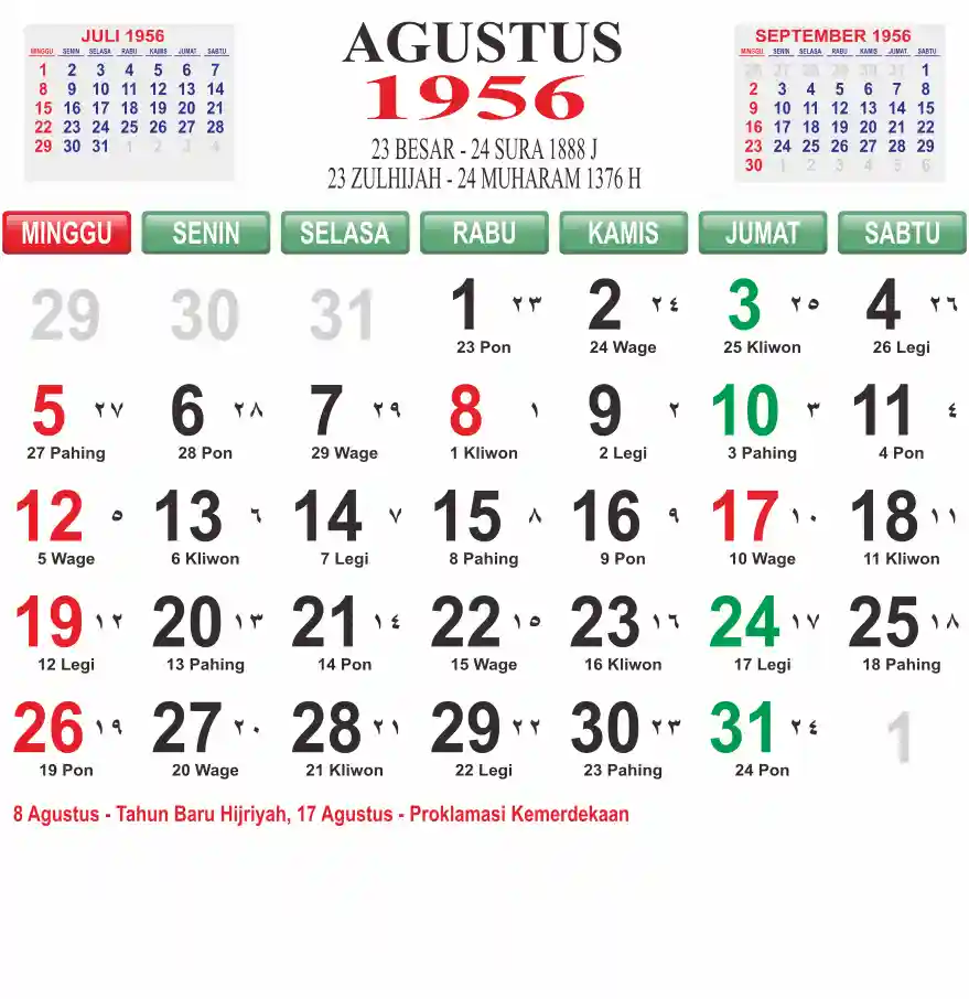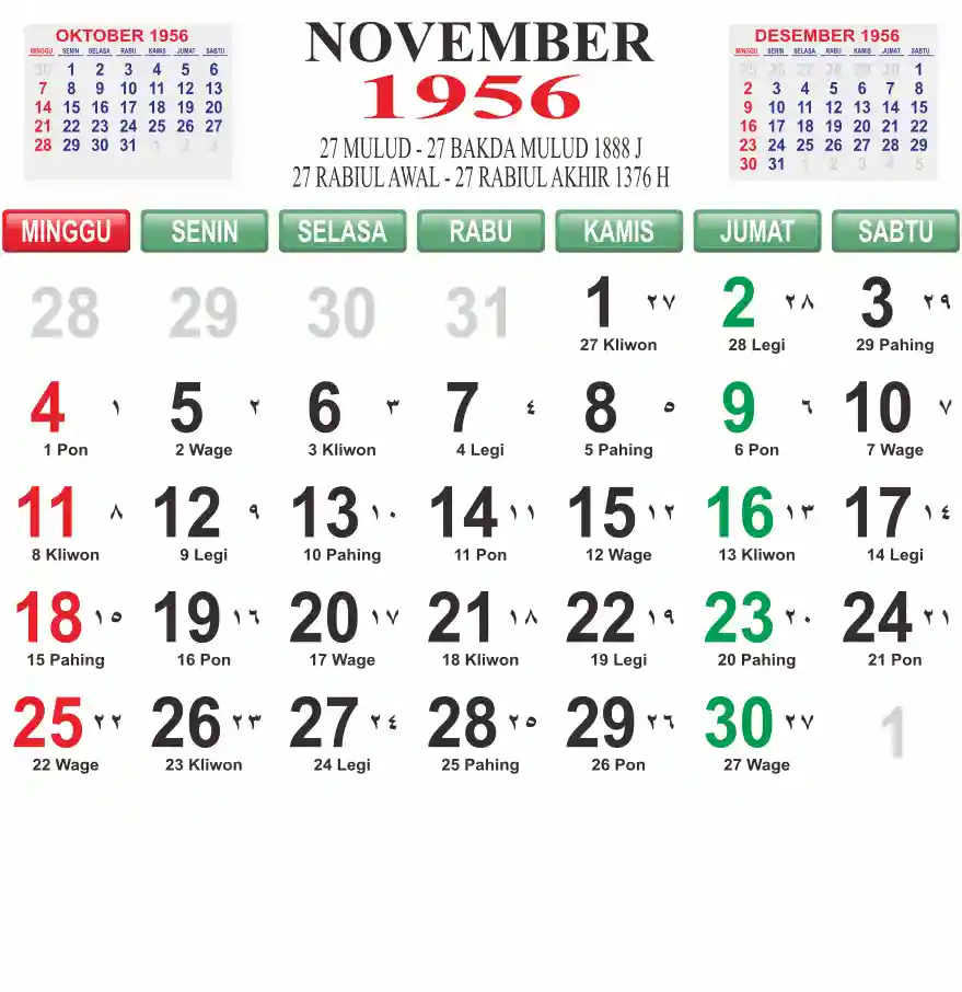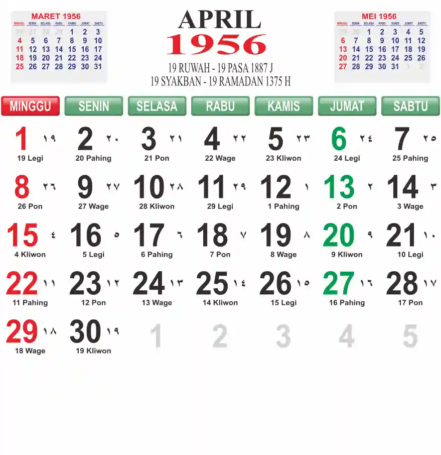Template kalender 1956 lembaran besar jumbo yang mudah di baca dari jarak jauh. Kalender ini biasanya di cetak 1 lembar per bulan.