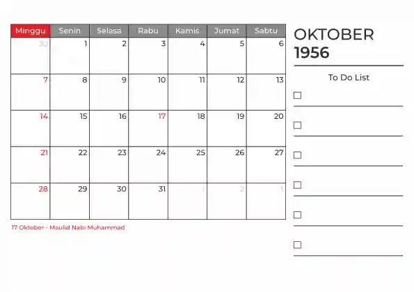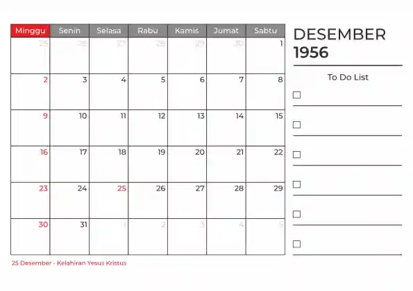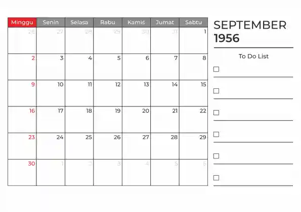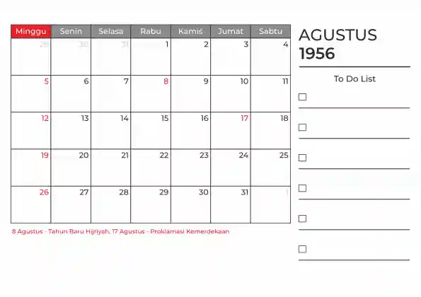 Template kalender 1956 duduk planner. Ada space kosong yang bisa di isi untuk menulis catatan dan ada space untuk menulis to do list.
