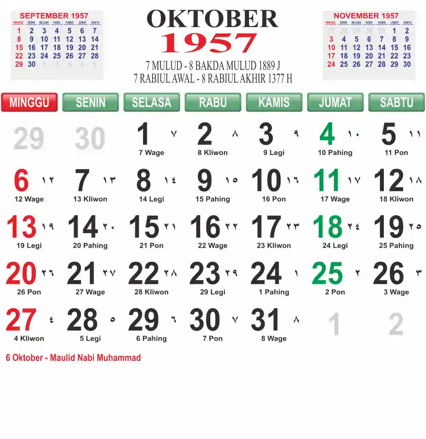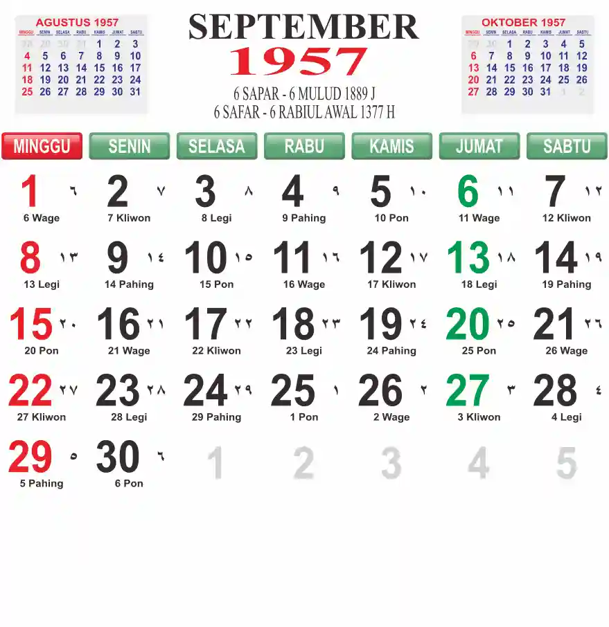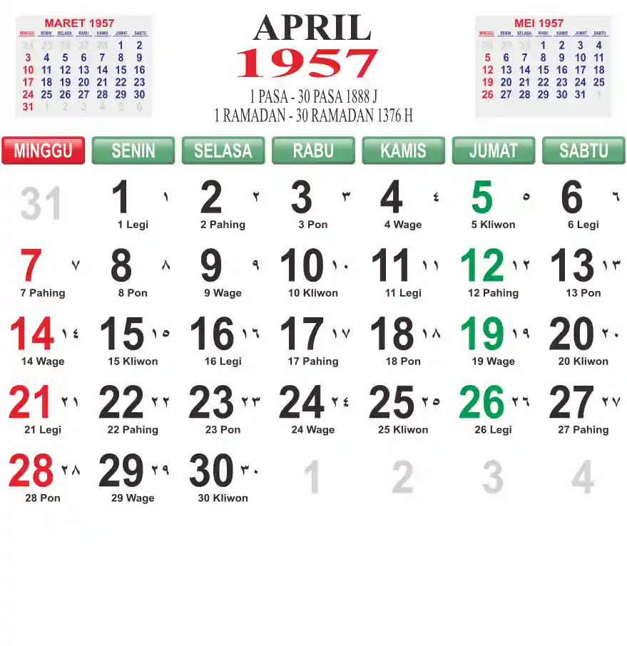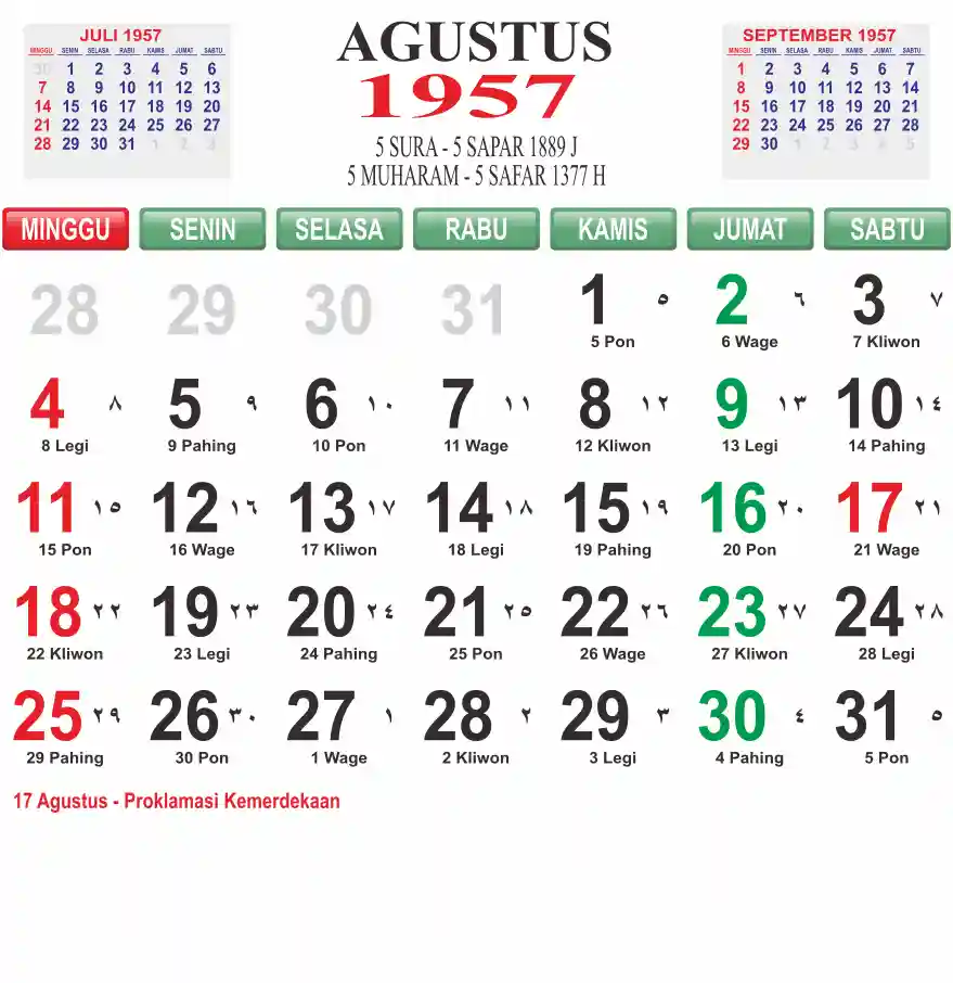 Template kalender 1957 lembaran besar jumbo yang mudah di baca dari jarak jauh. Kalender ini biasanya di cetak 1 lembar per bulan.