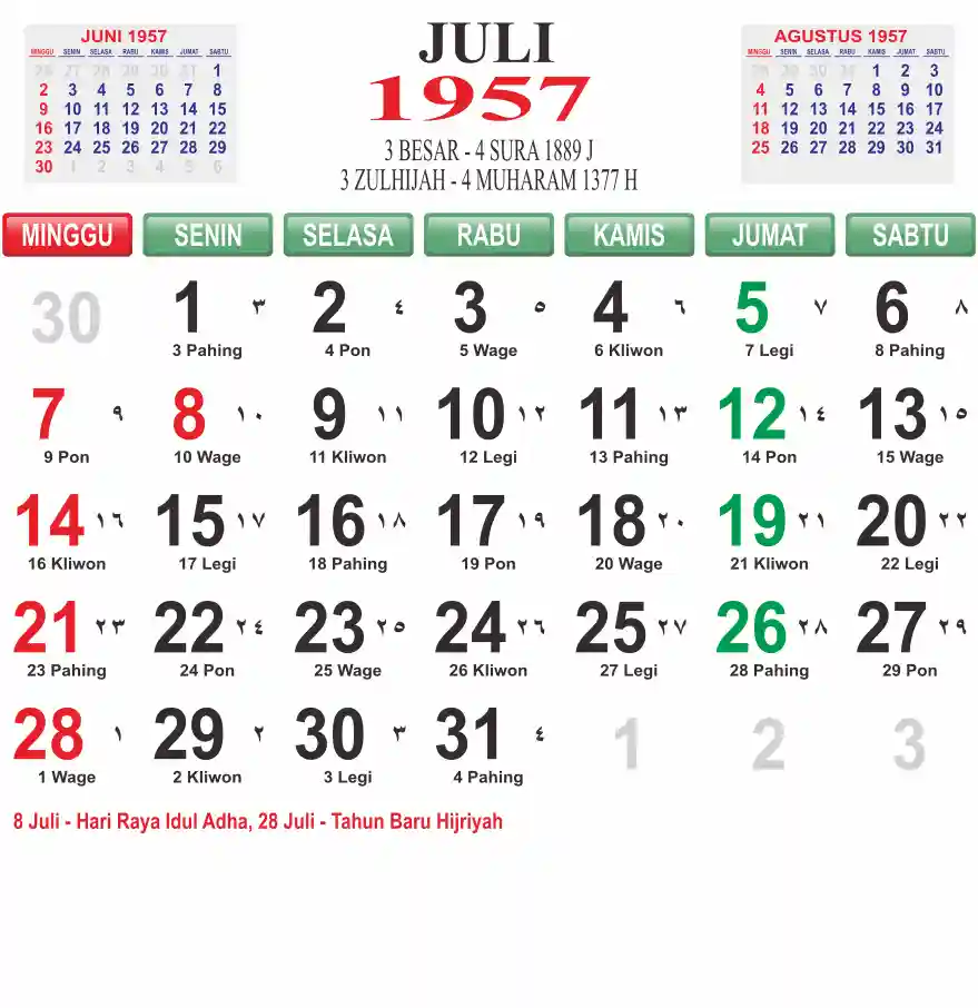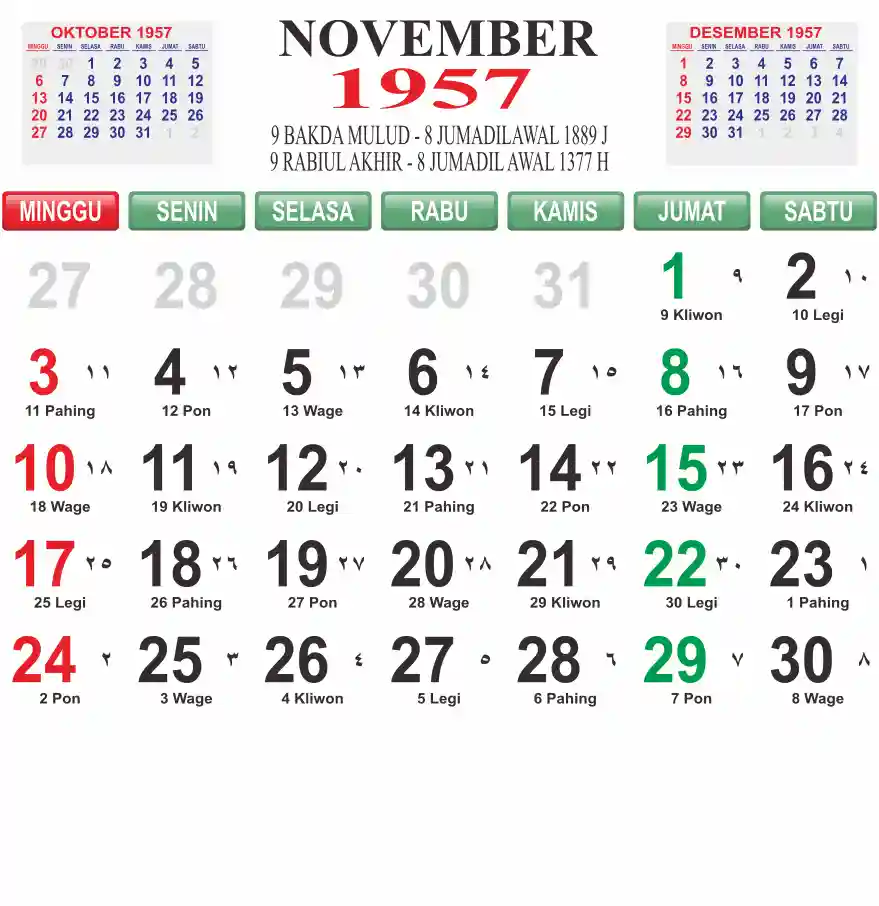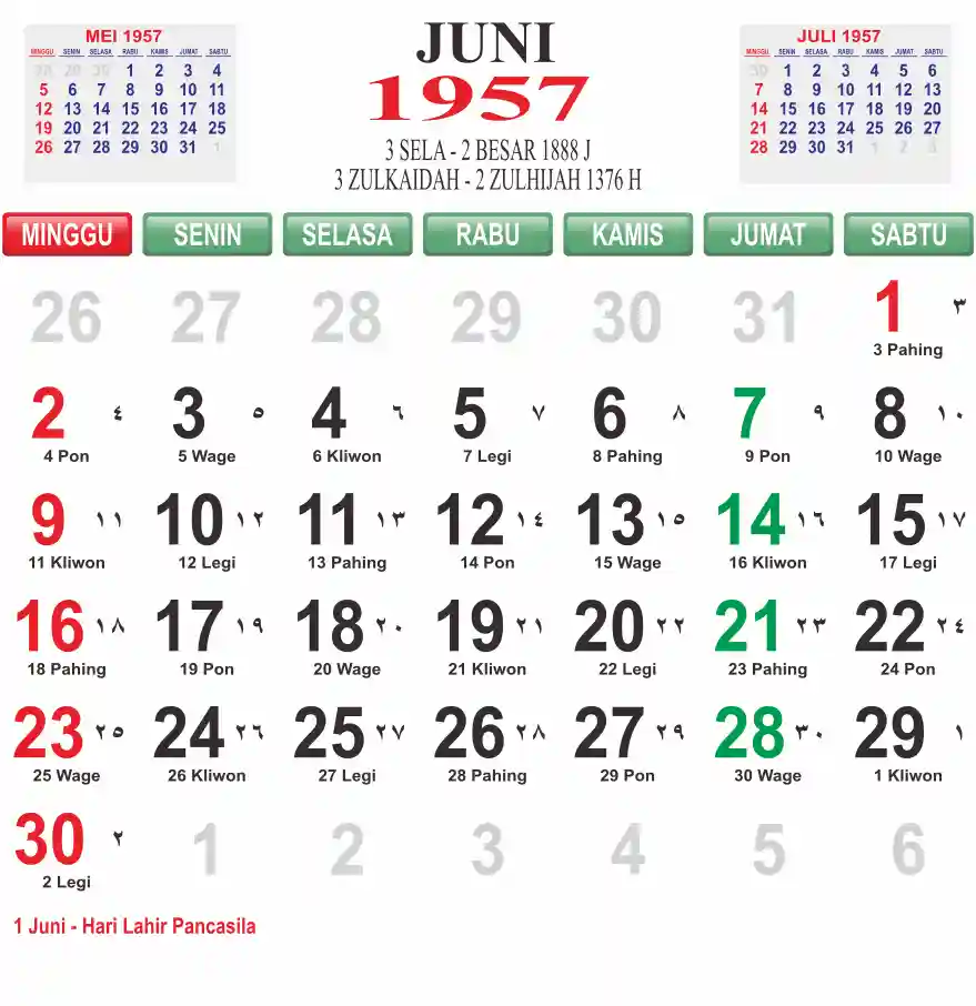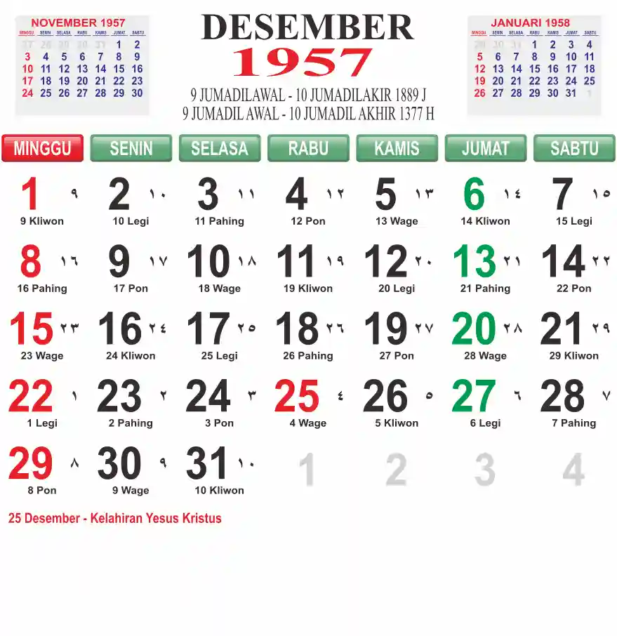 Template kalender 1957 lembaran besar jumbo yang mudah di baca dari jarak jauh. Kalender ini biasanya di cetak 1 lembar per bulan.