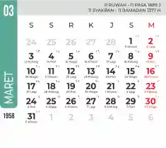 Template kalender 1958 dengan konsep minimalis modern dengan warna yang soft, cocok sekali buat kantor / bisnis seperti bank.