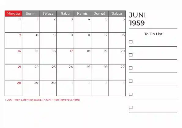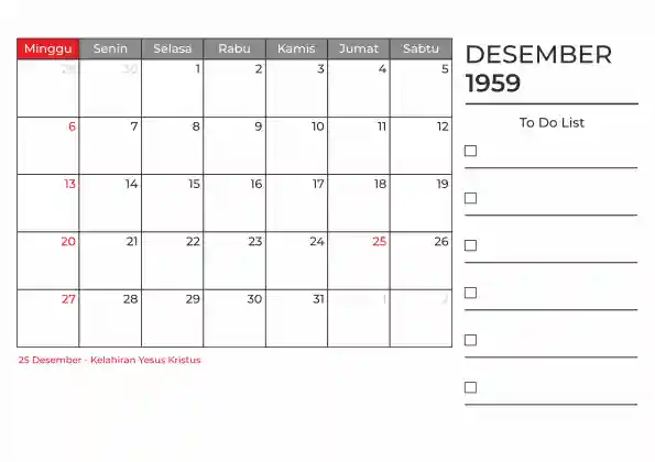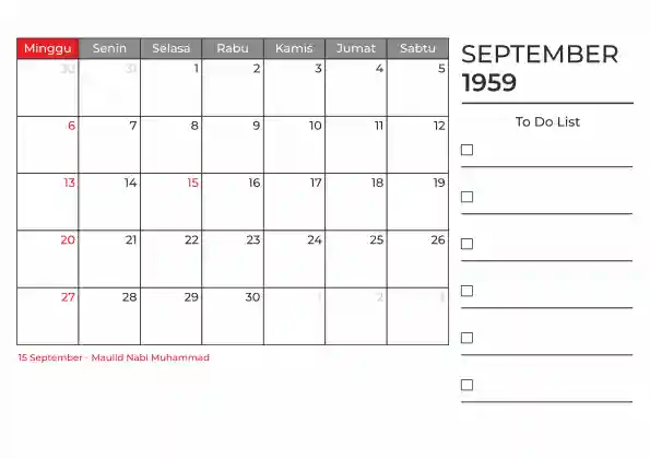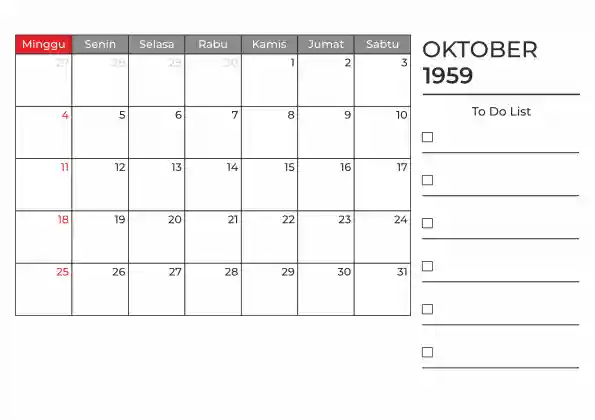Template kalender 1959 duduk planner. Ada space kosong yang bisa di isi untuk menulis catatan dan ada space untuk menulis to do list.