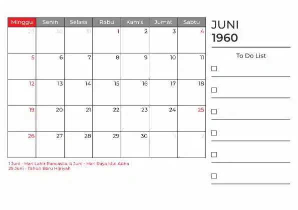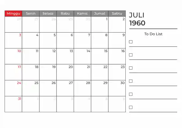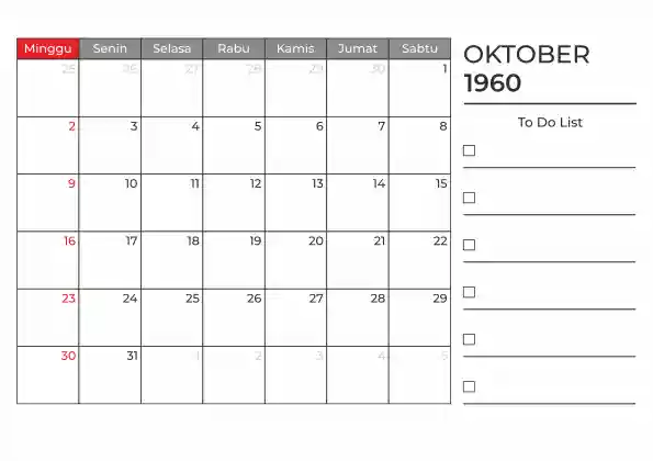 Template kalender 1960 duduk planner. Ada space kosong yang bisa di isi untuk menulis catatan dan ada space untuk menulis to do list.