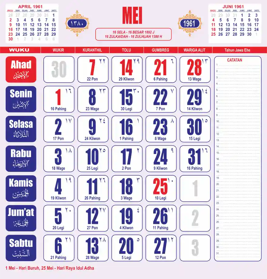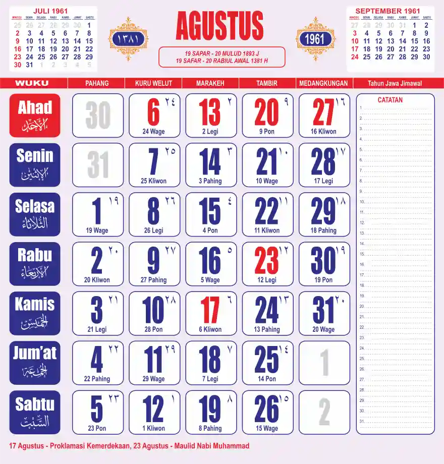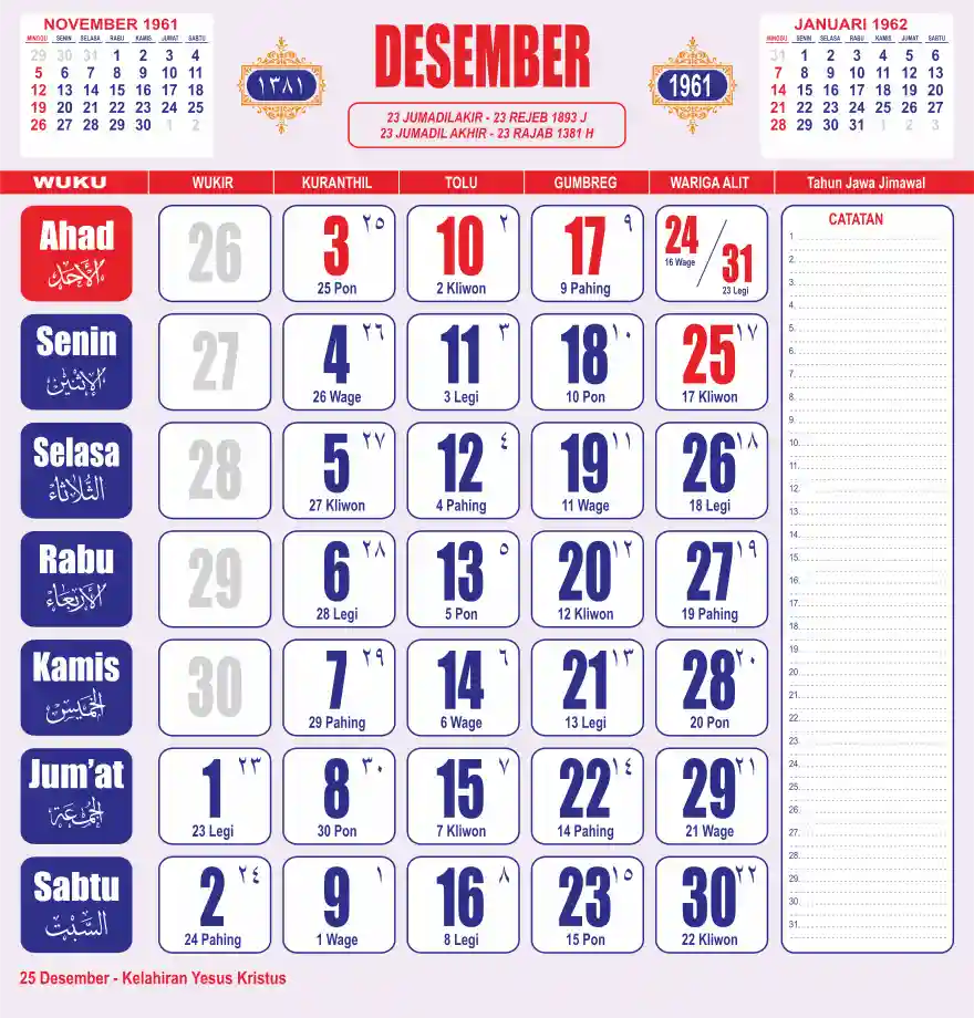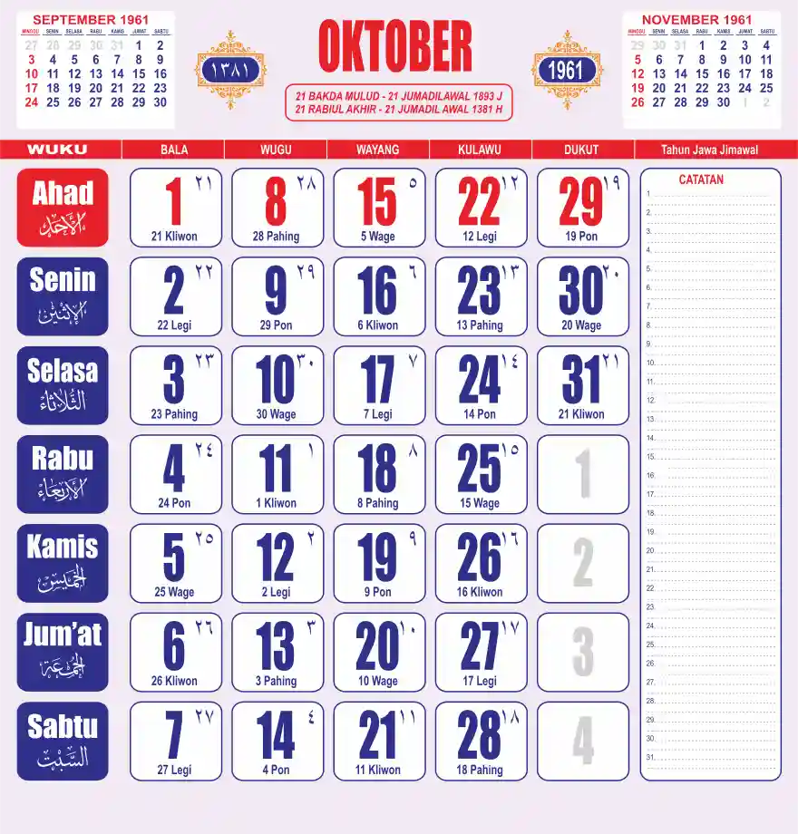Template kalender 1961 lembaran besar jumbo yang sering dipakai oleh masyarakat jawa lengkap dengan wuku. Kalender ini biasanya di cetak 1 lembar per bulan.