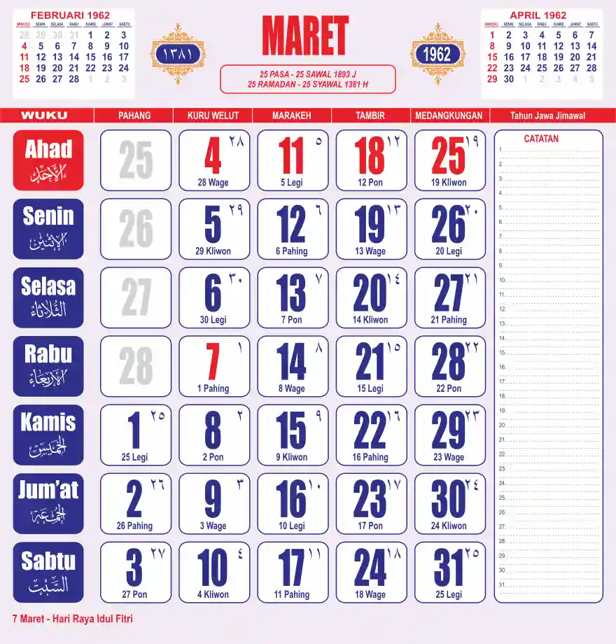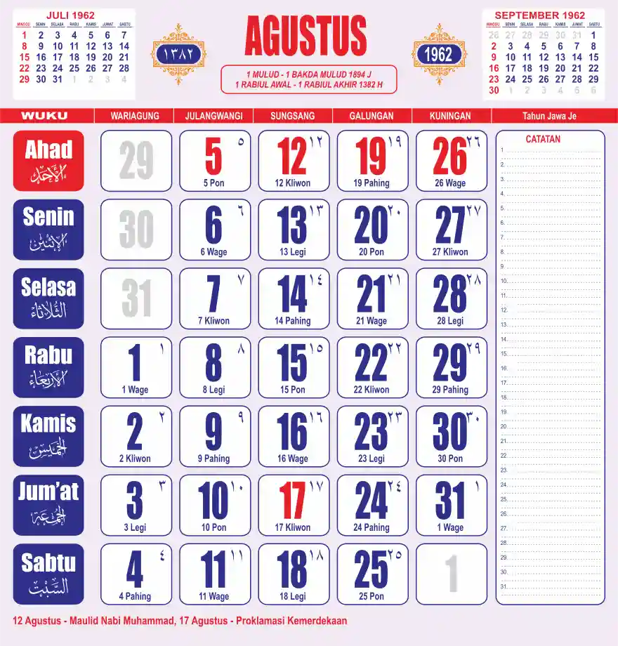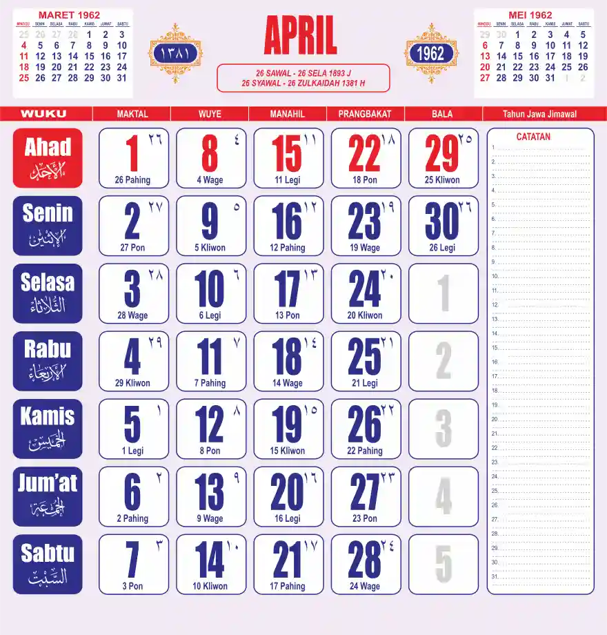 Template kalender 1962 lembaran besar jumbo yang sering dipakai oleh masyarakat jawa lengkap dengan wuku. Kalender ini biasanya di cetak 1 lembar per bulan.