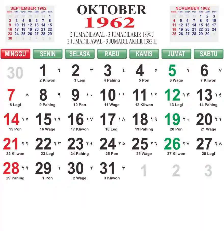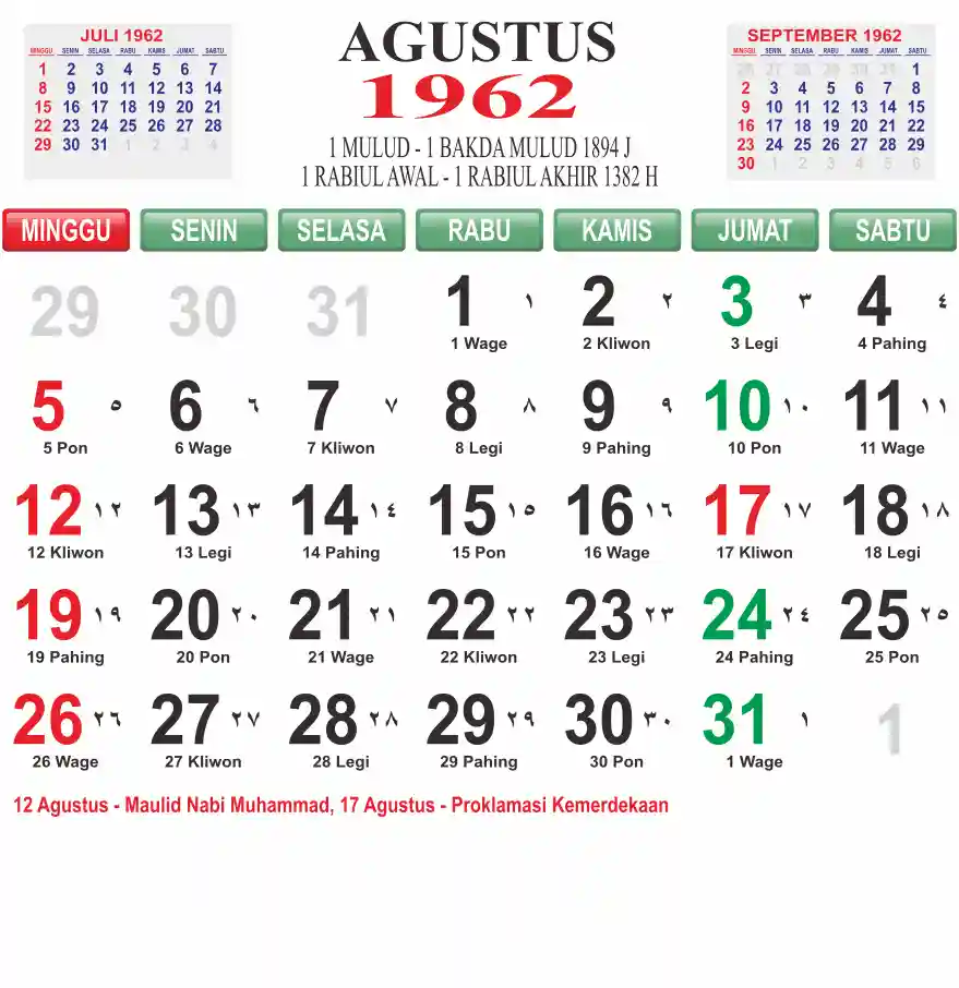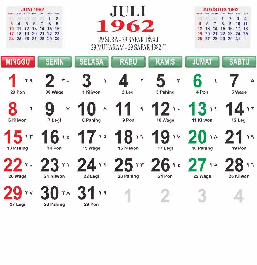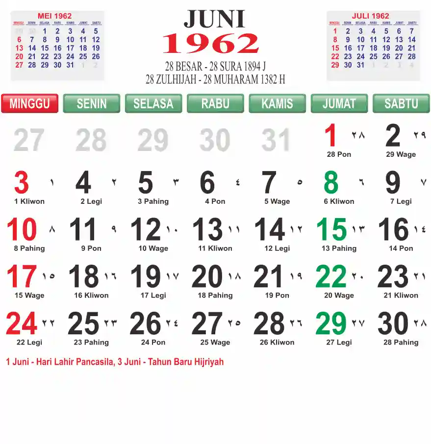 Template kalender 1962 lembaran besar jumbo yang mudah di baca dari jarak jauh. Kalender ini biasanya di cetak 1 lembar per bulan.