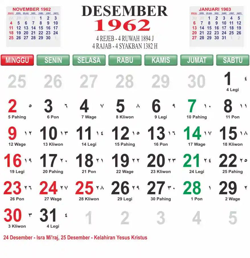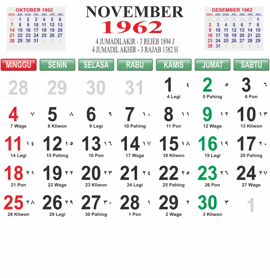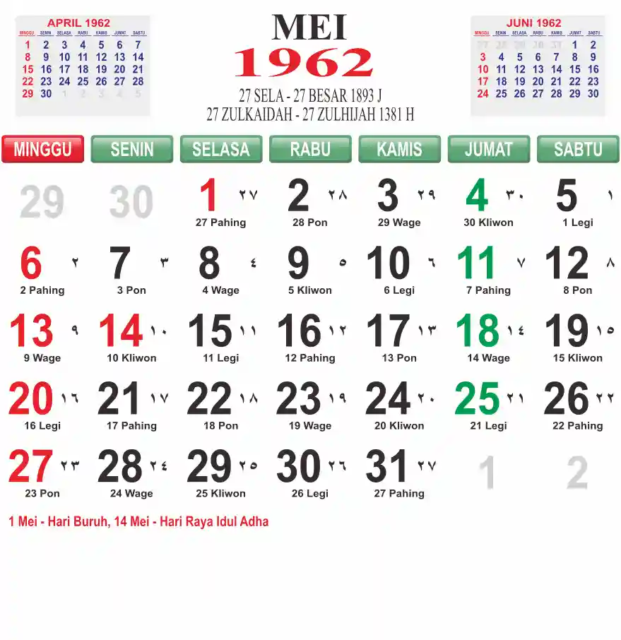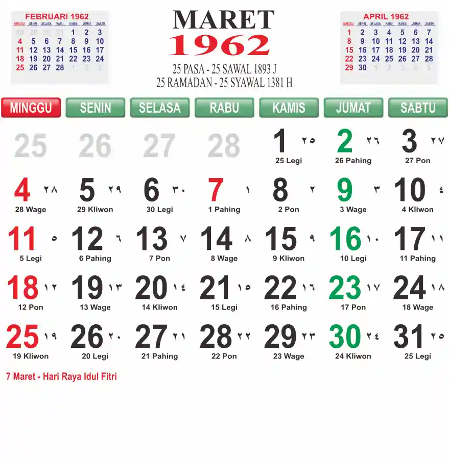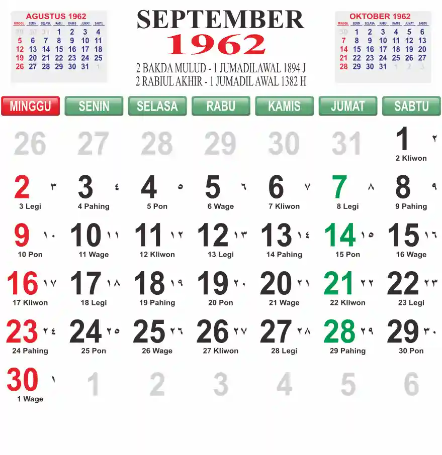 Template kalender 1962 lembaran besar jumbo yang mudah di baca dari jarak jauh. Kalender ini biasanya di cetak 1 lembar per bulan.