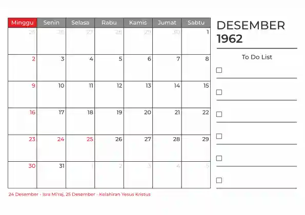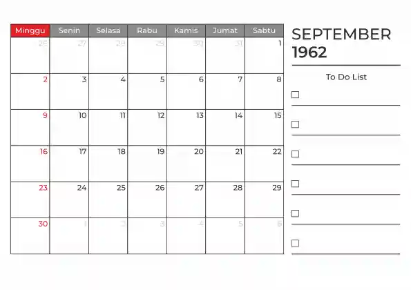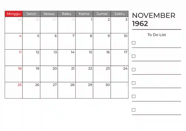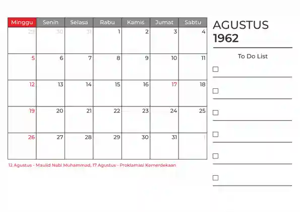 Template kalender 1962 duduk planner. Ada space kosong yang bisa di isi untuk menulis catatan dan ada space untuk menulis to do list.