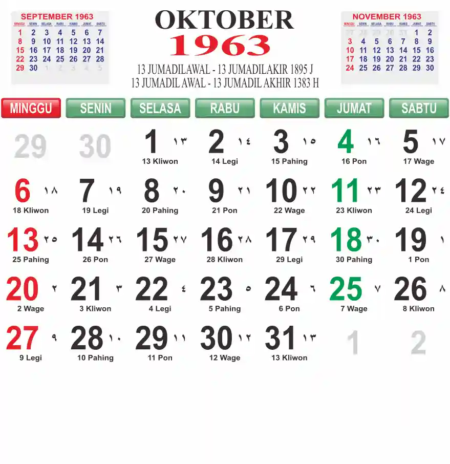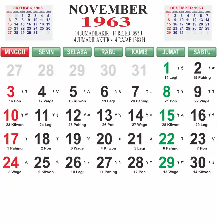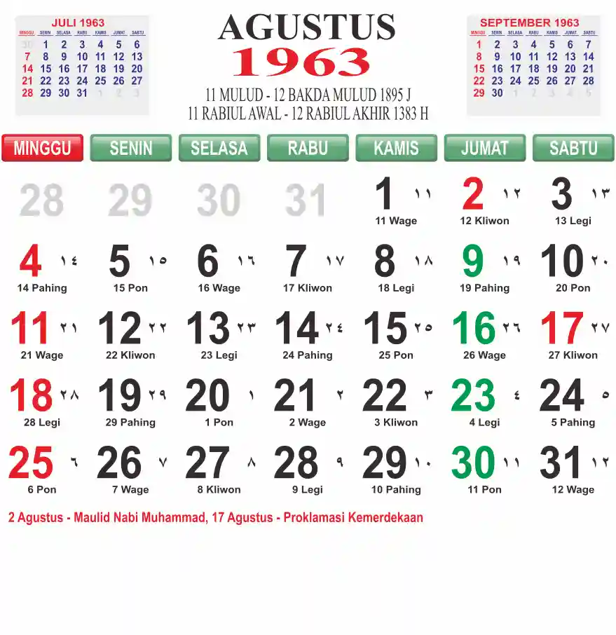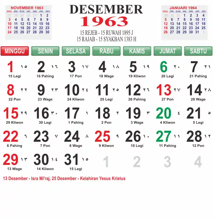 Template kalender 1963 lembaran besar jumbo yang mudah di baca dari jarak jauh. Kalender ini biasanya di cetak 1 lembar per bulan.