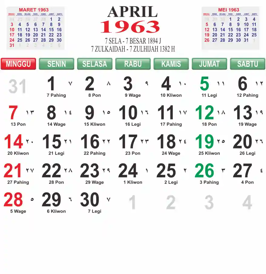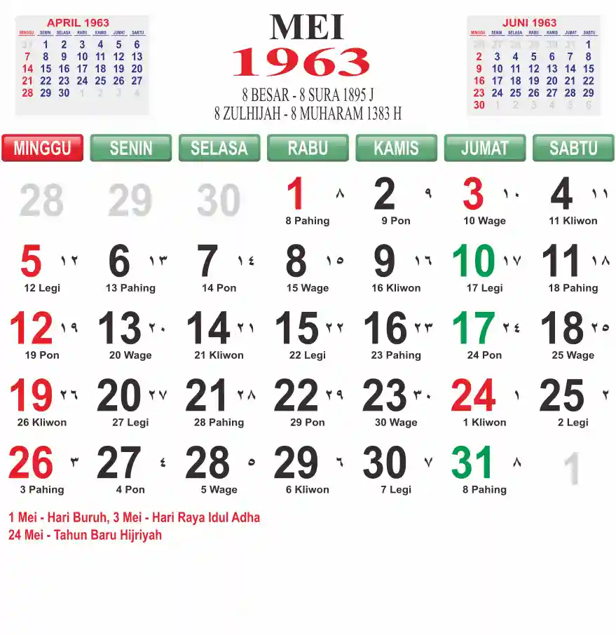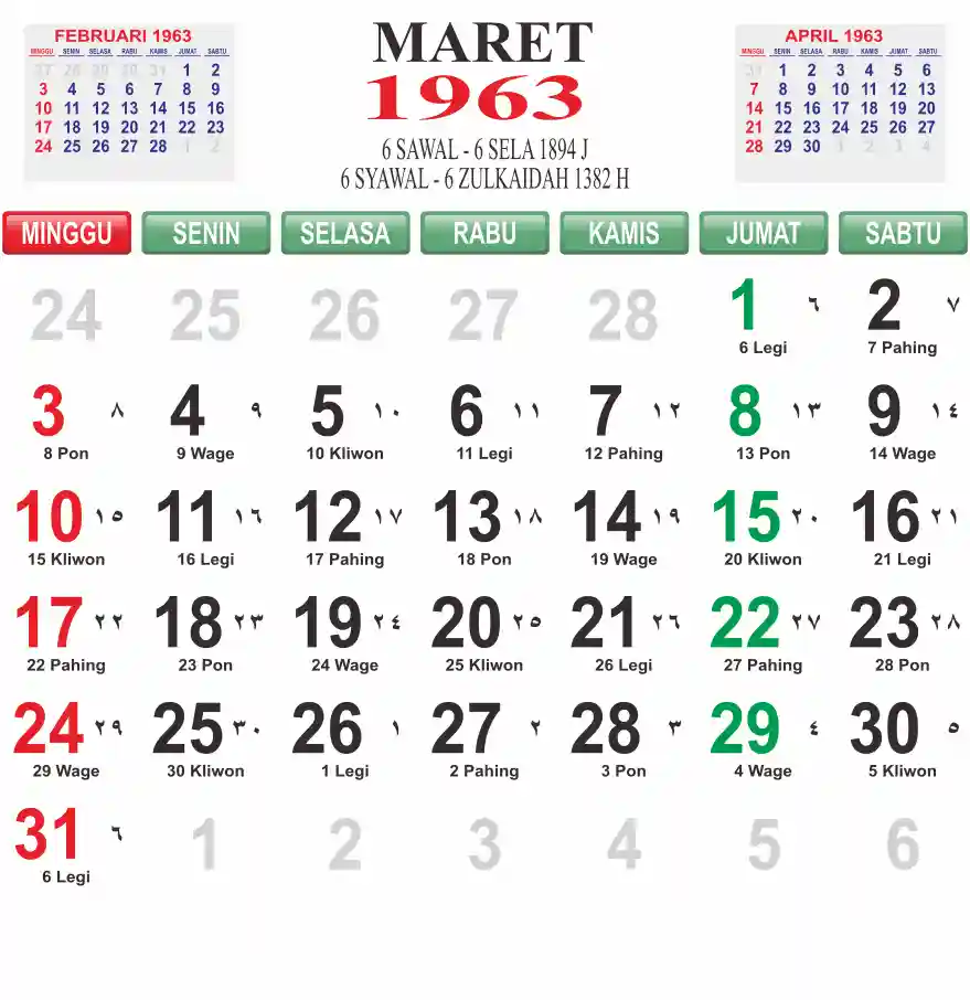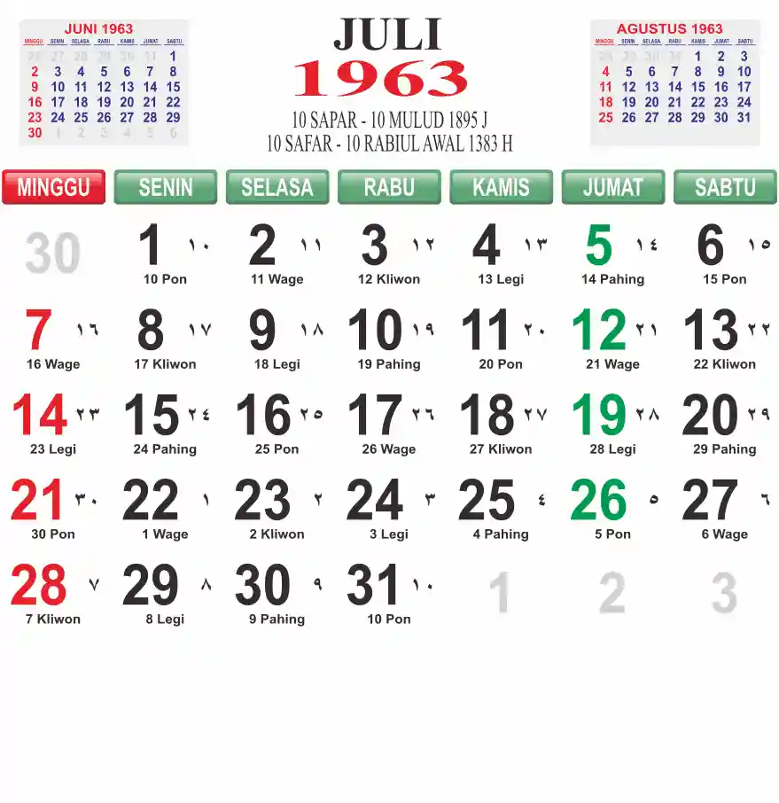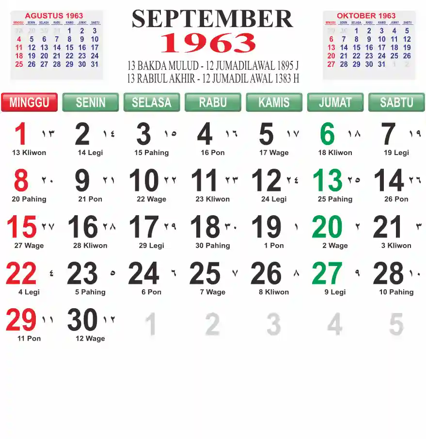 Template kalender 1963 lembaran besar jumbo yang mudah di baca dari jarak jauh. Kalender ini biasanya di cetak 1 lembar per bulan.