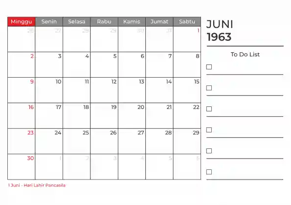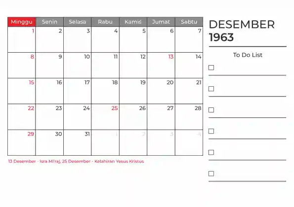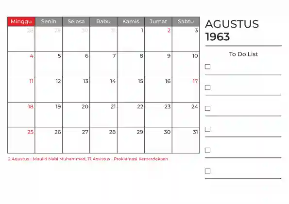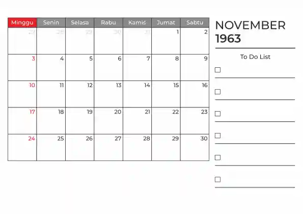 Template kalender 1963 duduk planner. Ada space kosong yang bisa di isi untuk menulis catatan dan ada space untuk menulis to do list.