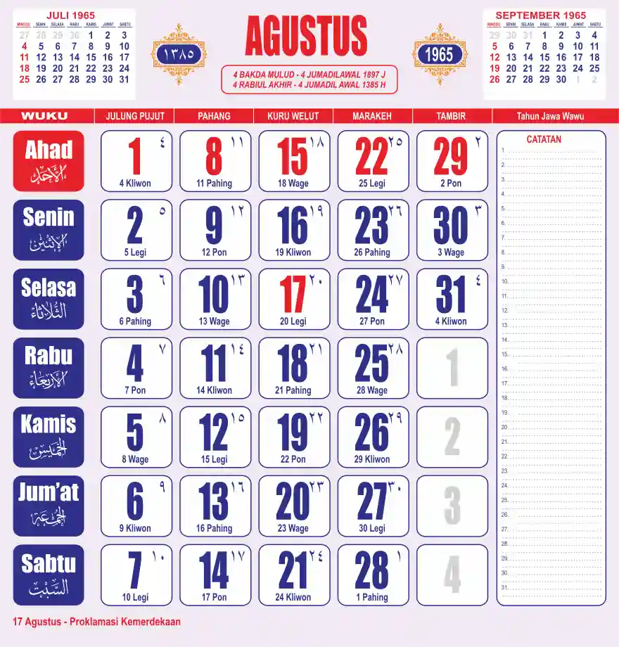 Template kalender 1965 lembaran besar jumbo yang sering dipakai oleh masyarakat jawa lengkap dengan wuku. Kalender ini biasanya di cetak 1 lembar per bulan.