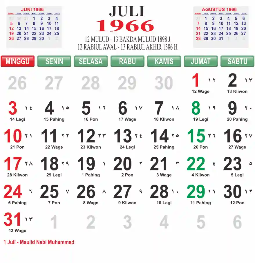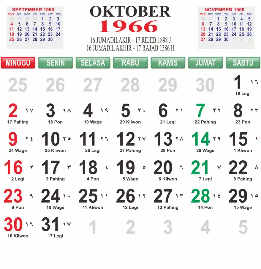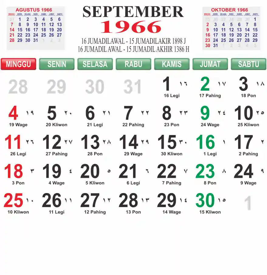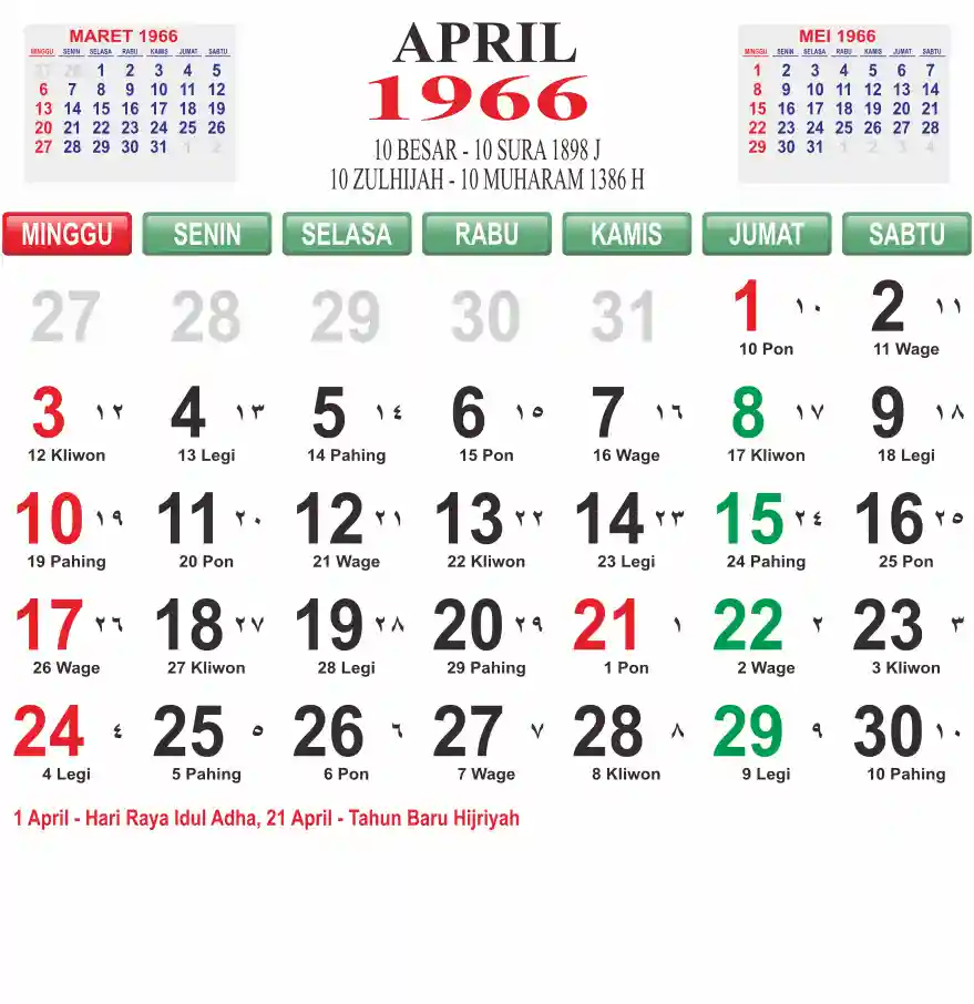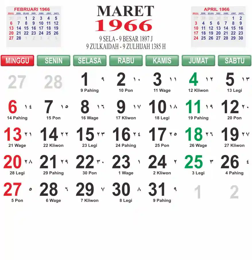 Template kalender 1966 lembaran besar jumbo yang mudah di baca dari jarak jauh. Kalender ini biasanya di cetak 1 lembar per bulan.