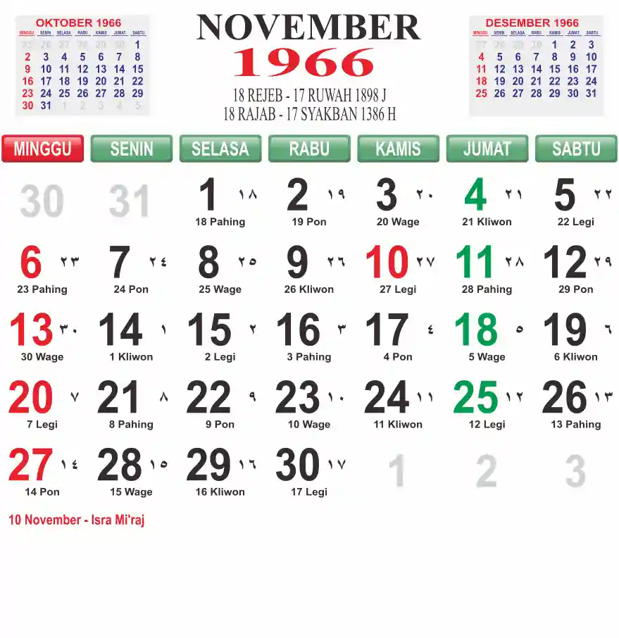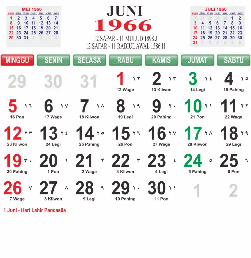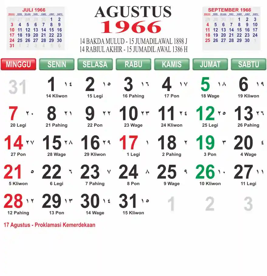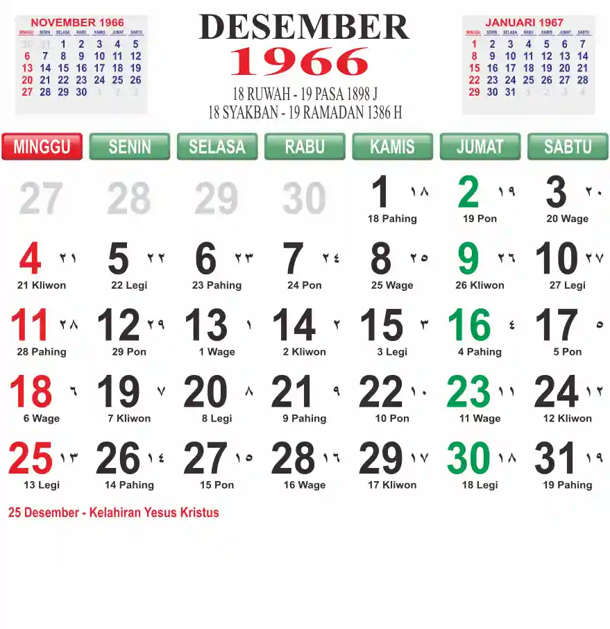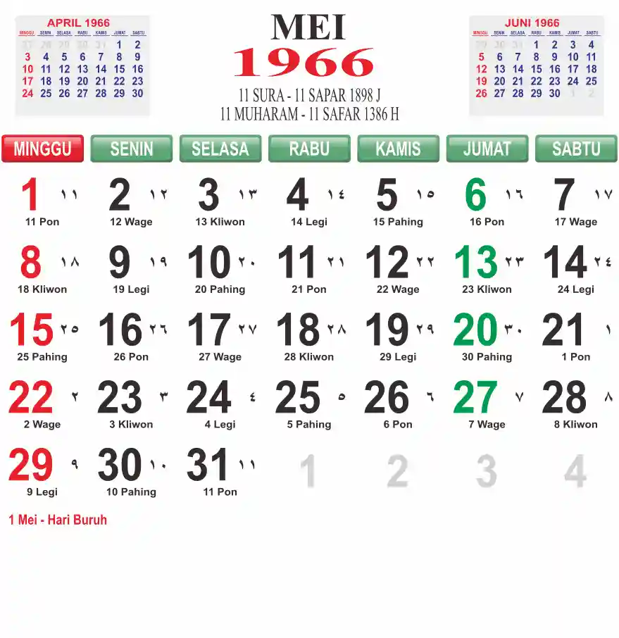 Template kalender 1966 lembaran besar jumbo yang mudah di baca dari jarak jauh. Kalender ini biasanya di cetak 1 lembar per bulan.