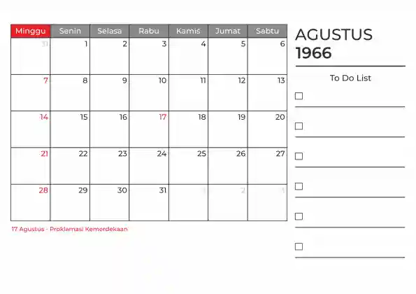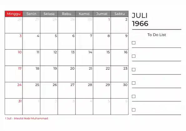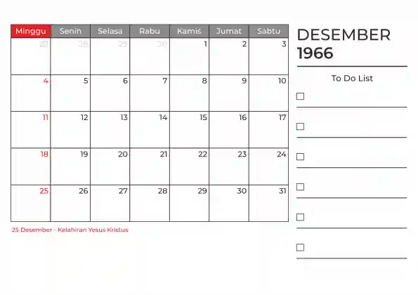 Template kalender 1966 duduk planner. Ada space kosong yang bisa di isi untuk menulis catatan dan ada space untuk menulis to do list.