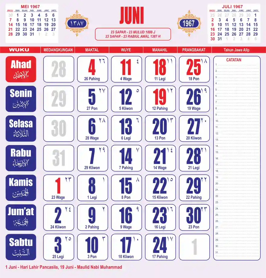 Template kalender 1967 lembaran besar jumbo yang sering dipakai oleh masyarakat jawa lengkap dengan wuku. Kalender ini biasanya di cetak 1 lembar per bulan.